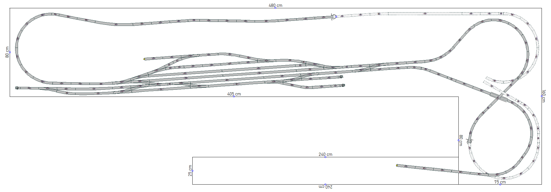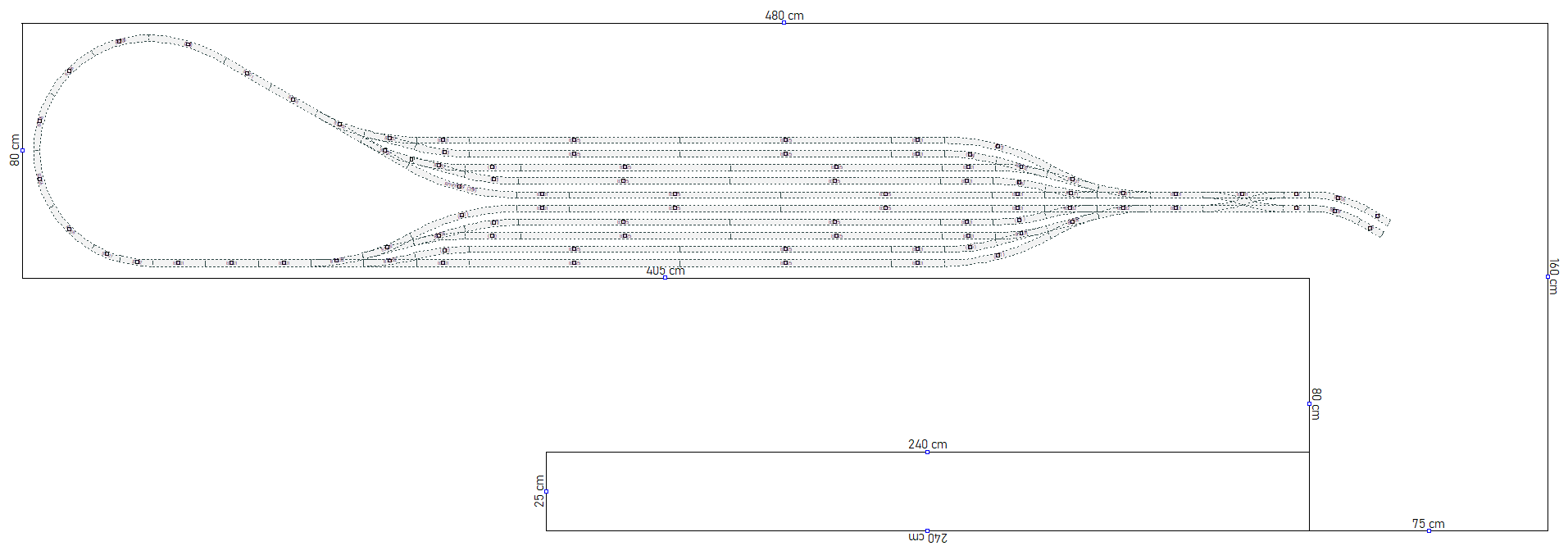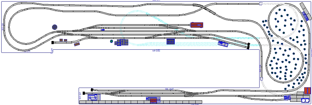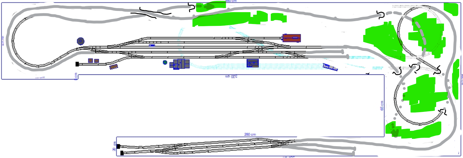 - dlouhý souběh kolejí vlevo vzadu působí nepřirozeně. Předpokládám, že kolejiště má znázorňovat i kus krajiny a přitom je na větší půlce souběh dvou tratí, které by se normálně potkaly až u stanice. A kdyby se potkaly dřív, vedly by nejspíš v jedné stopě. Co tam bude za krajinu, za stanicí? Tohle se mi nezdá, že by šlo rozumně zapojit.