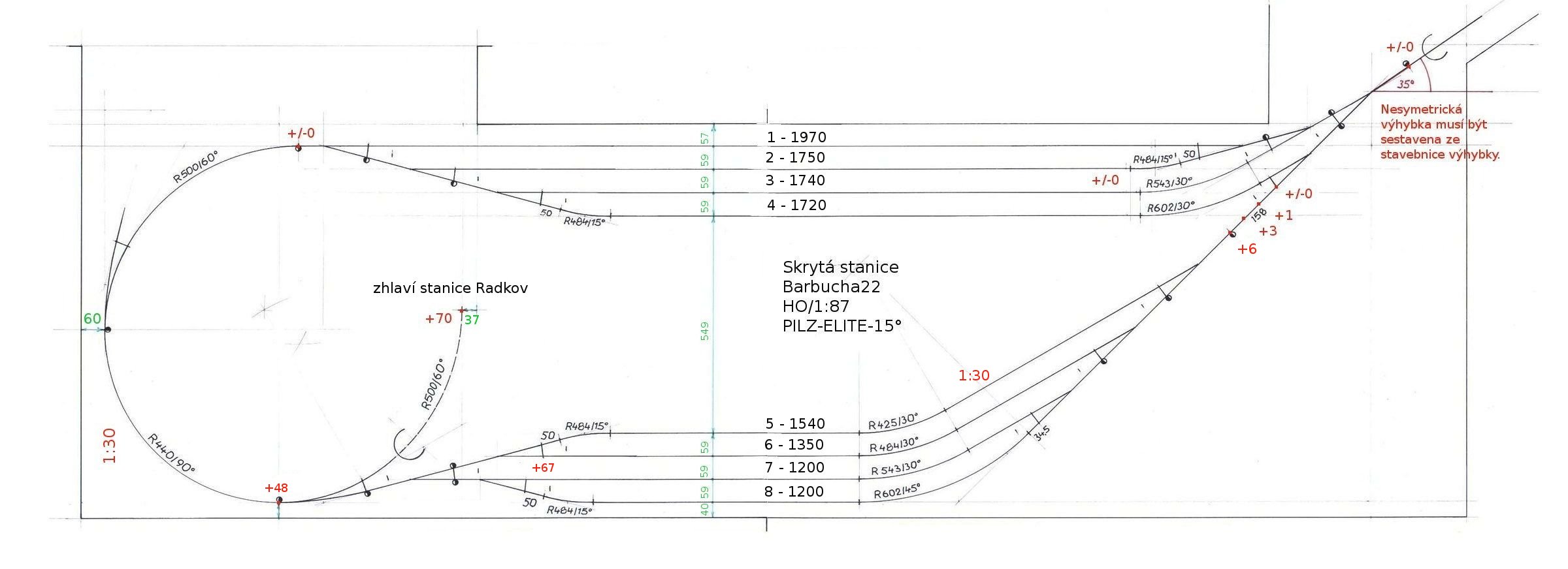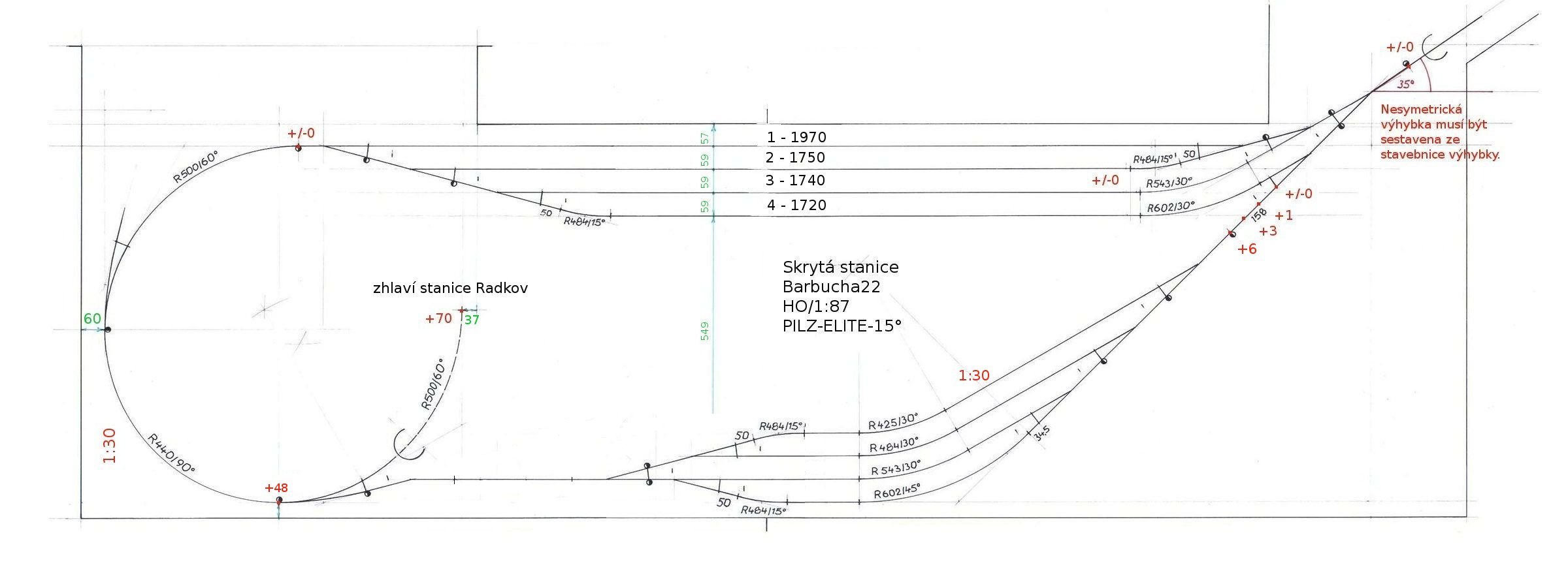 Studie stanice.Oblouková výhybka napravo je přesně zasazena v místech dle originálu návrhu od Barbuchy22.Nalevo z anglické výhybky může vést vlečková kolej do vlečkového areálu.Jde vidět,že stanička je tak akorát a její užitné délky dopravních kolejí,odpovídají délkům kolejí ve skryťáku.