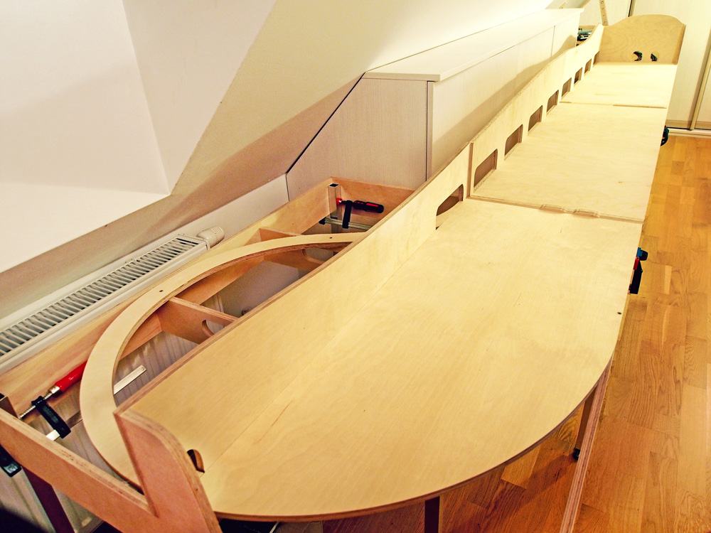 Při sestavení jsem nakonec objevil nějaké drobné chybičky, ale na finálním kolejišti s krajinou to nebude znát. Jo a udělal jsem si rovnou jedny nohy navíc - mám totiž připravený ještě jeden modul na vložení (širou trať mezi nádražím a vratným obloukem). Bohužel ale do místnosti se to už nevejde, před rozšířením budu tedy muset nejdřív vyřešit bydlení :D