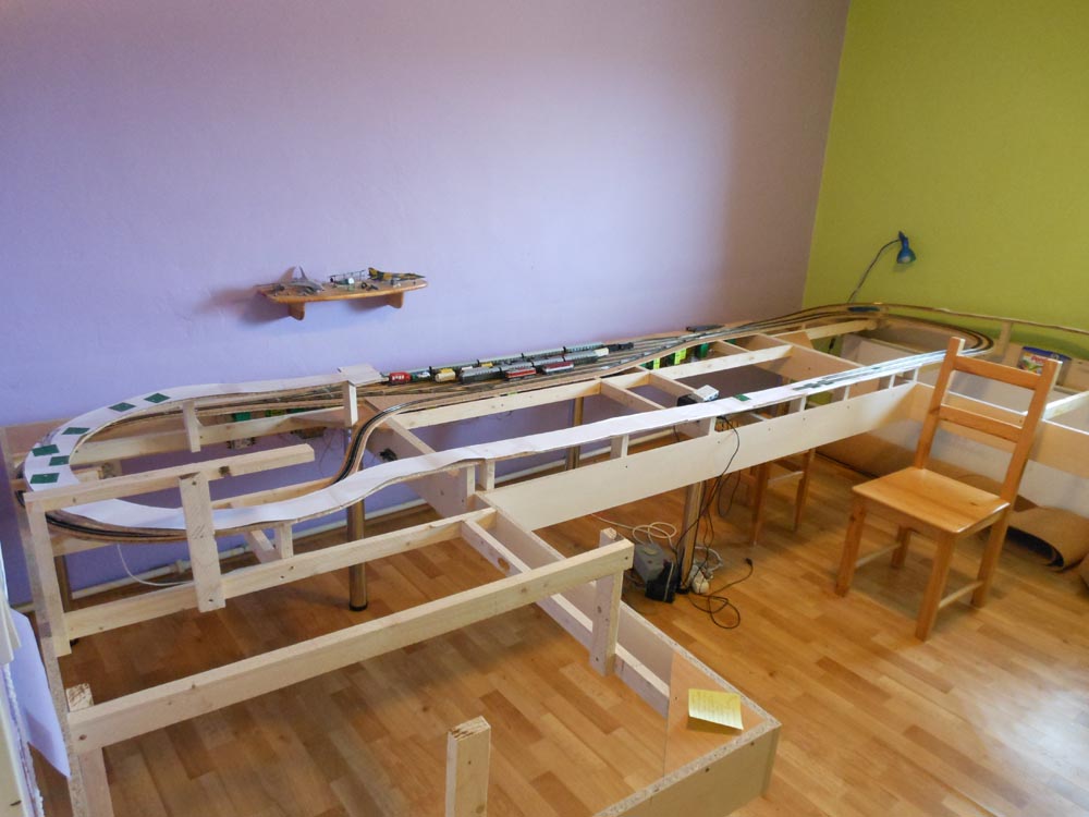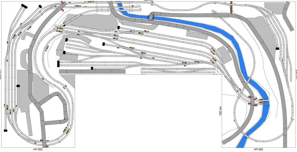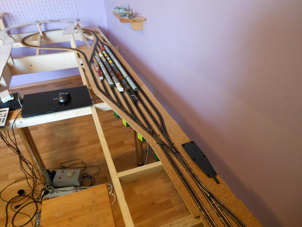 Snažil jsem se zapracovat kritické poznámky kolegů o napojování kolejí... Defakto od Lajblta jsem typově převzal hlavní nádraží a komplet převzal levé nádražíčko s továrnou. "Oželel" jsem v pokoji přístup k oknu a pravou stranu jsem protáhnul také na 2m (místa je zatím dost, ale nechci mít megaplán, abych ho dokončil).