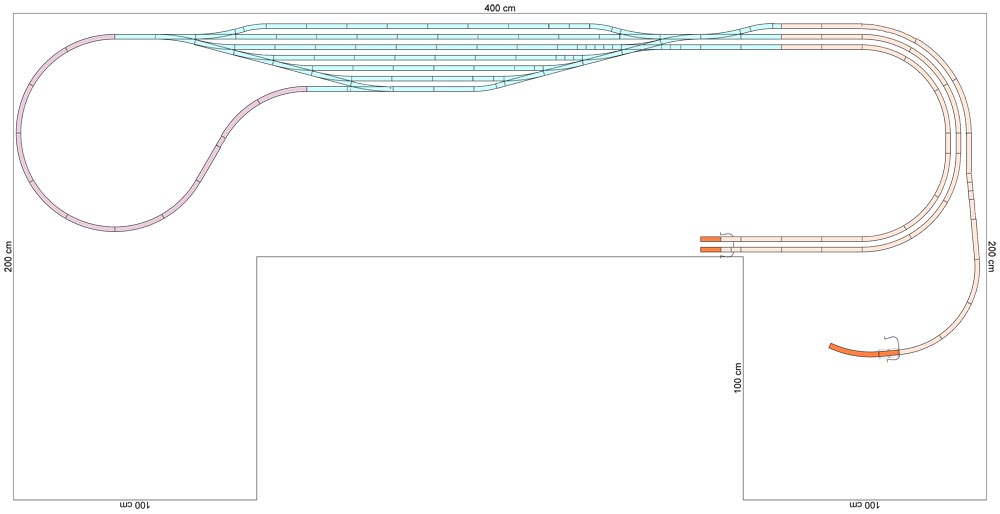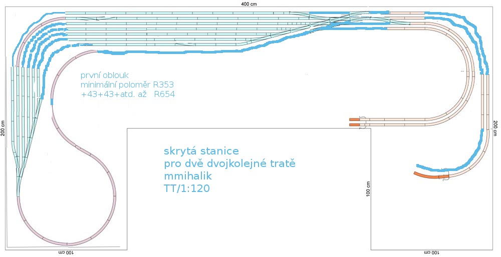2 mmihalik: Děkuju za plánek, mám bohužel špatné zprávy - stávající návrh má několik vážných chyb. Stoupání z hlavní do odbočné stanice je 46 promile, navíc na poloměru R353 (a se zakružovacími poloměry to vychází na 50+ promile - nedá se to rovnou zlomit do stoupání). Na pravé straně stanice jsou protioblouky malých poloměrů a navíc jsou obloukové koleje na pravé straně doslova zlomeny na poloměr menší než R310 (našel jsem 1x R257 a 1x R142). Délka objízdných dopravních kolejí je jen ~60 cm (to není ani na Brejlovce a 3 rychlíkové vozy), hlavní jsou dlouhé ~90 cm (to je tak tak).