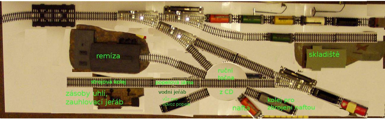 No, a zrovna ty dve vyhybky vlevo před remízou by se daly nahradit točnou... Ušetřil bys místo a kdyby sis udělal točnu samo-domo, tak i peníze.