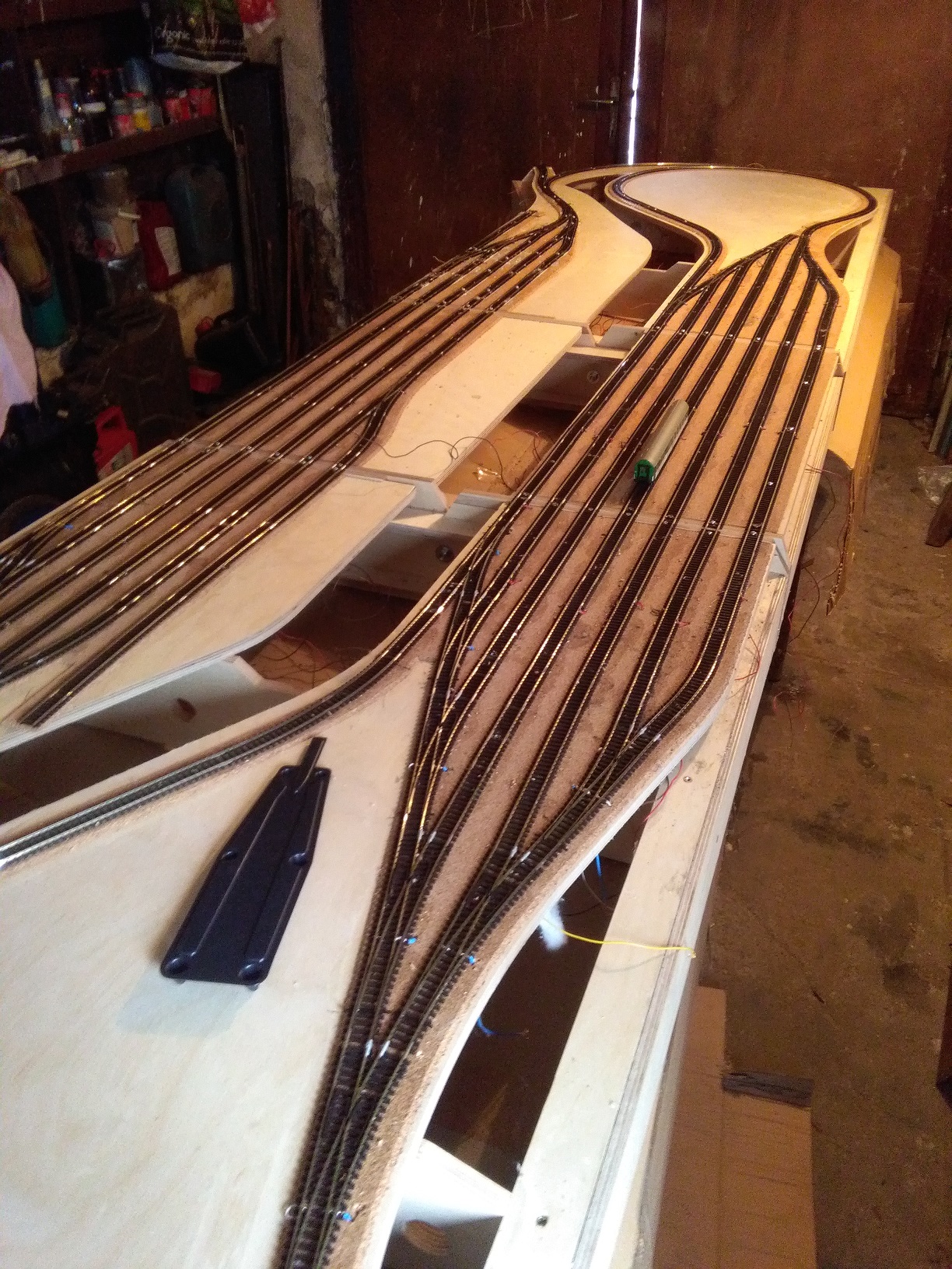 Nyní už je kolejiště doma a složené a ve fázi testování. Musí se ještě vyladit kolejové spojení mezi segmenty, zapojit kolejiště do PC (jelikož překlikávat výhybky v Multimouse se fakt nedá) a také vyřešit spřáhla, protože Tilligovská se mi často rozpojují, uvažuji proto o Kuehnu nebo Peho.
