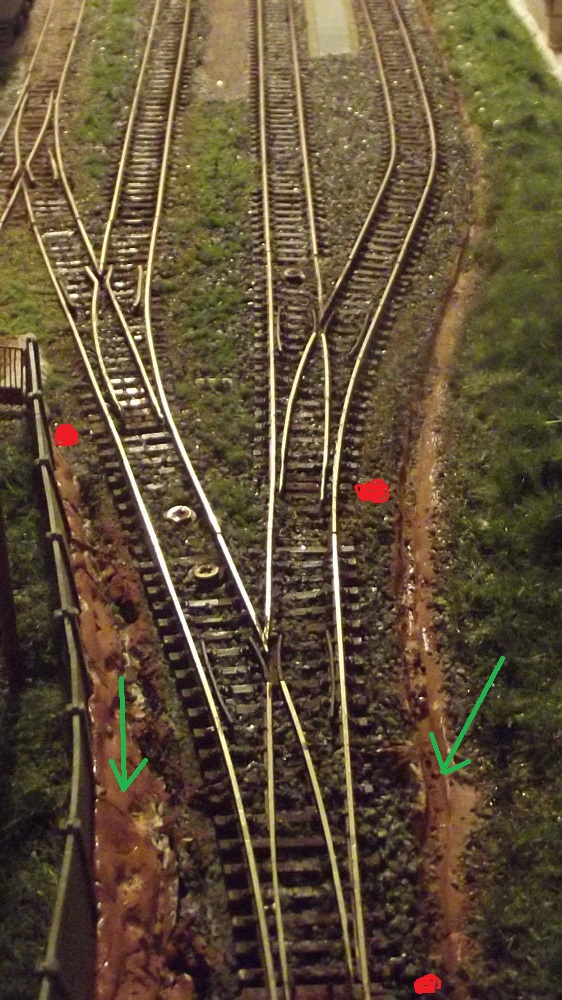 Ve stanicích je odvodnění zpravidla řešeno trativody, případně zakrytými koryty. Taky proto se mi nelíbí ten neprůhledný plot vlečky, relativně blízko koleje.