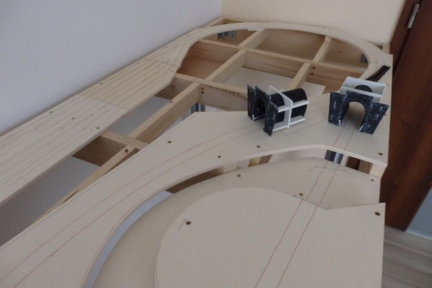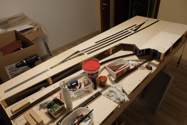 Na konci musíš mít místo na lokomotivu, aspoň. U první koleje u budovy bude skladiště a vjezdu třeba vlečka, jen pozor, vozy na ni budeš muset přistavovat přes vjezdové zhlaví, když se s nimi do šturcu nevejdeš. Kolej na druhé straně je manipulační pro objíždění soupravy, ta navedí, že je krátká, na ní nic stát nebude. A zůstává ti dlouhá kolej na osobák a další na náklady.