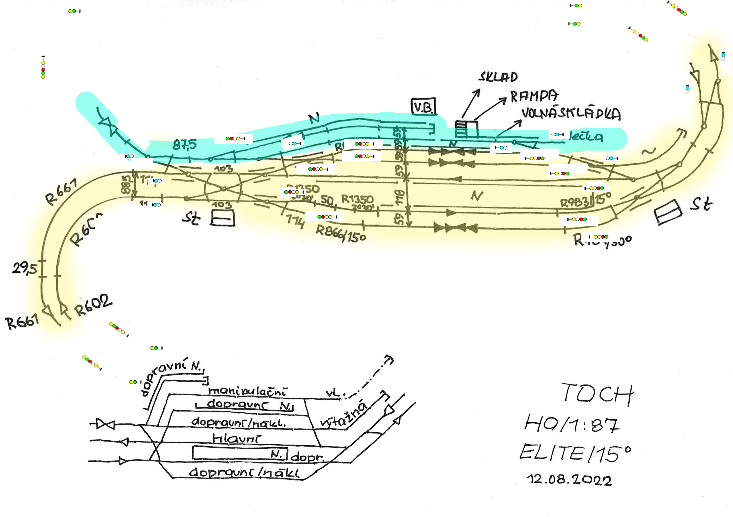 Ale (viz schéma) levý oblouk R661 a R602 potřebuju již teď natáhnout finálně až po kolejovou spojku, a zde se nachází jádro pudla: jak udělat DO tak aby byla připravena pro budoucí nádraží abych nemusel dořezávat koleje a donapojovat. Předpokládám, že k jednoznačné odpovědi se budu muset zamyslet už nad celým nádražím.