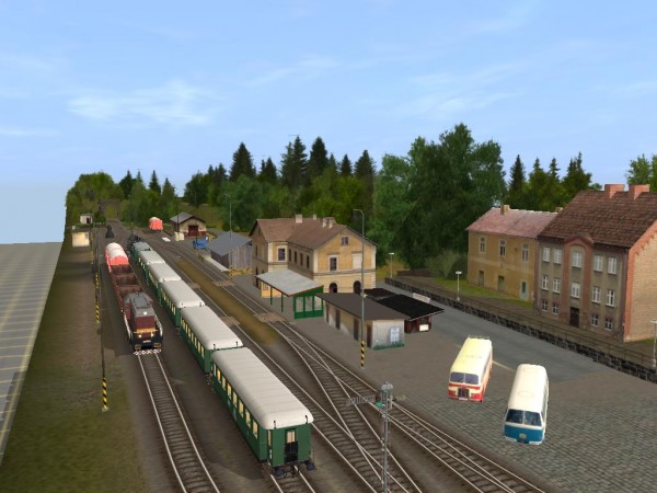 Tak nakonec bych to řešil asi kompromisem. Cesta by mohla vést nakonec zleva, jak psal mizl, ale aby vlak nenaroloval auto až do tunelu, tak jsem ji vedl podjezdem. K remíze jsem zkusil přidat ještě jednu kusou kolej na odstavení něčeho. Jinak pro úplnost, staniční kolej, nejdelší má 900mm(délka flexky peco), výška mezilehlá st. 120mm, výhybna 180 a koncová 190mm, SN nula, klesání do smyček 2,5cm/metr. Poloměry na viditelné R320,R360, oblouk na vedlejší vlevo jen R220, ale bude v lese.