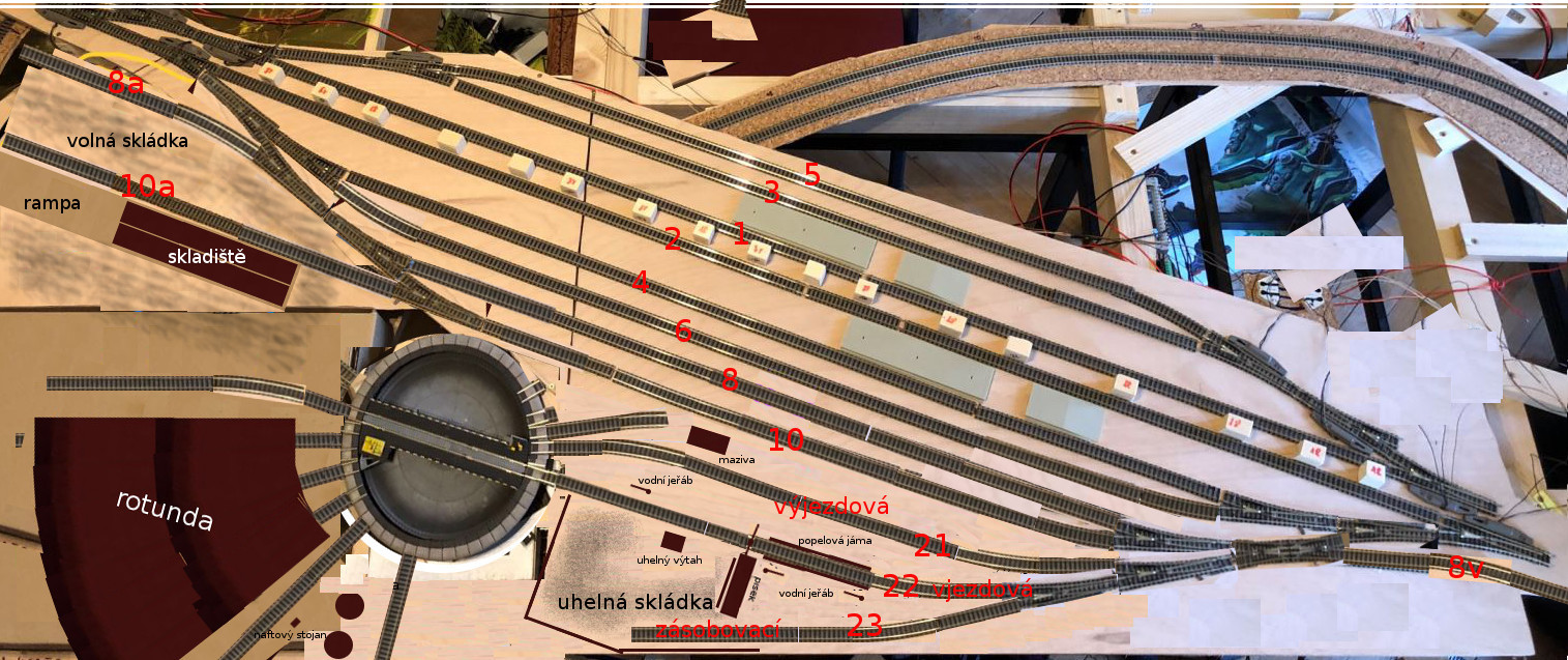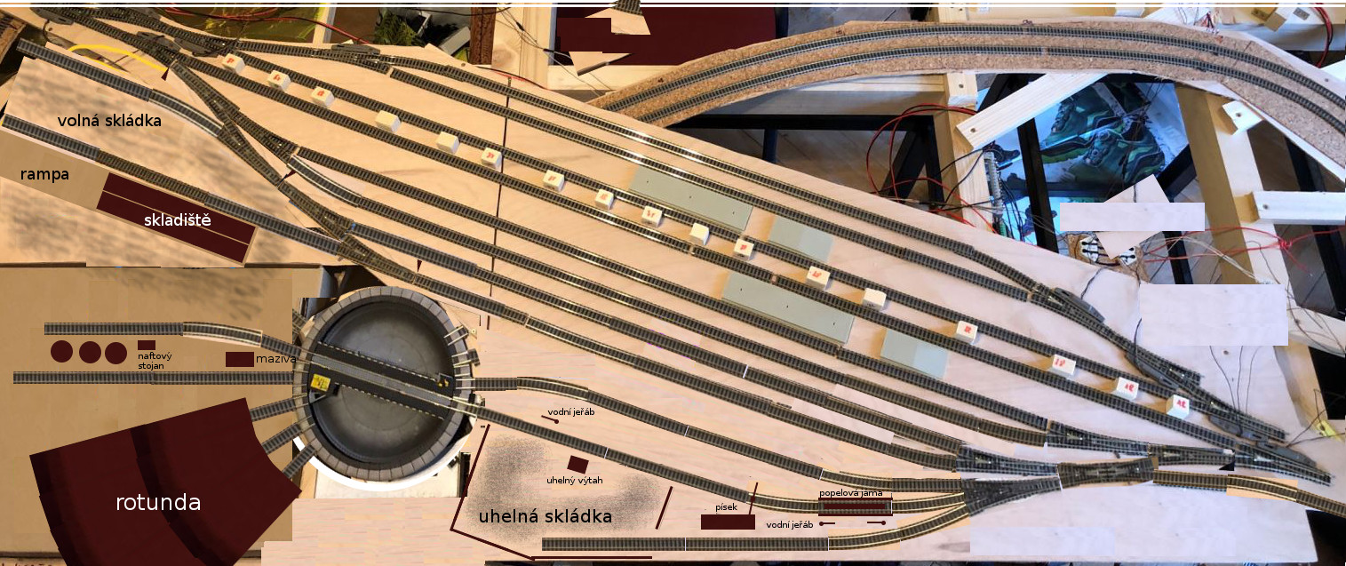 Popsaná kolej v lokomotivním depu s názvem "zásobovací" slouží k přísunu uhlí na uhelnou skládku.