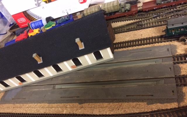 Nezvolil jsem z důvodu údržby, prachu a pod., že bych stavbu slepil se spodkem stavby. Je dost velká na to, jak se tam vždy dostat a vymýšlel jsem jak to udělat. Nakonec jsem upravil spodek, úchyty napustil lepidlem, jak se kdysi dělalo, než přišly lepty, trochu to dopiloval a funguje to a drží to k mé spokojenosti. Bylo to trošku otravnější chodit s tím stále ke kolejišti, když se stavba lepila, aby to přesně sedělo, když se lepily mnohé prvky, přeci jen papír pracuje s lepidlem - takže slepit, uchytit, zatížit a zase další část...