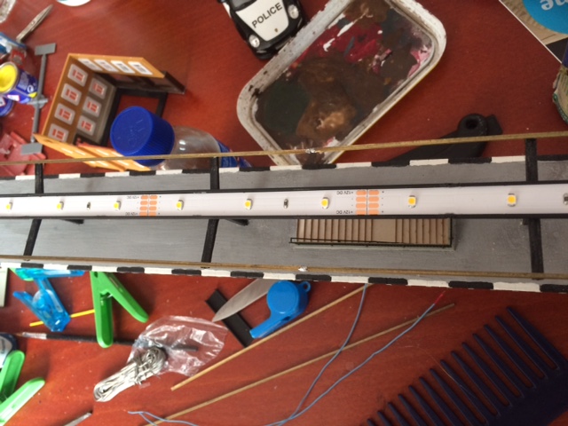 Zde obrázek připraveného osvětlení, než je otočeno do správné polohy. SMD diody nejsou vůbec z boku vidět. Takže pak to bude chtít jen regulaci intenzity osvětleni a mohlo by to být OK. Nikdo bohužel nedělá modelové zářivky a s tím se sám dělat nemíním, takže mi stačí led pásky... Když je někdo udělá, mohu je napojit snadno na kovové profily a svítit tímto.