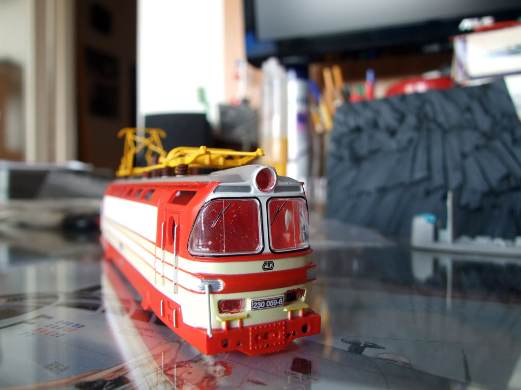V květnu a červnu 2016 jsem stavěl Laminátku. Na Atlasu jsem koupil statický model Laminátky 230 059-8. Model je čínské výroby, ale i přesto není úplně špatný. S několika vylepšeními by šel použít jako pojízdný model. Aby model vypadal reálně a zároveň byl funkční, jsem provedl několik úprav. V každém případě je nutné vyměnit celý podvozek. Masky podvozků a imitace skříní s tyčemi pro přenos tažných sil se dají použít. Dobrá recenze na model čínské Laminátky je na těchto stránkách. Začal jsem pátrat po internetu, který tovární pojezd (nejlépe bez úprav) by se dal použít pro Laminátku. Nakonec na stránkách DiskuzeModely.biz jsem dostal vyčerpávající odpověď s několika variantami továrních pojezdů, které by se daly použít. Já jsem se rozhodl pro Roco 73375 Re 4/4 II SBB, nejlépe sedí všechny rozměry a model má paprsková kola. Laminátku i Re 4/4 II jsem rozebral a začal přemýšlet, jak vše skloubit dohromady. Nejdřív jsem u Re 4/4 II demontoval pojezd, který jsem kompletně odstrojil. Upravil jsem podvozky, na které jsem přidělal masky z Laminátky tak, aby vše bylo funkční, obrousil jsem střed rámu, aby se na něj daly přidělat imitace skříní s tyčemi pro přenos tažných sil a celý rám a podvozky včetně kol jsem nastříkal šedivou barvou Gunze Mr. Color 335, pak jsem celý pojezd zkompletoval a odzkoušel. Potom jsem začal upravovat karoserii, nejdříve jsem se pustil do zprovoznění světel. Světla jsem vyndal z karoserie a očistil ředidlem Gunze Mr. Color Leveling Thinner od stříbrné a červené barvy, kterými byla světla natřena. Je nutné použít nějaké neagresivní ředidlo, které nerozleptá umělou hmotu. Pak jsem upravil karoserii Laminátky a světla na pojezdu tak, aby bylo vše funkční, podrobný popis všech úprav je pod fotkami. Následovala úprava dálkového světla, světlo má průměr 4 mm, takže bylo nutné koupit diodu této velikosti. Tento rozměr diody není běžný, takže jsem ji sehnal v jediném internetovém obchodě Svět žárovek. Diodu bylo nutné také upravit a vyvrtat do karosérie otvor o průměru 4 mm, opět vše popisuju pod fotkami. Dále jsem se pustil do stanoviště strojvedoucího, přístrojová deska od Číňanů vypadá celkem slušně, takže jsem ji použil. Po různých zkouškách vytvoření stanoviště jsem nakonec dospěl k rozhodnutí, že udělám kompromis a použiju původní stanoviště z Re 4/4 II s úpravami, aby pasovalo do karoserie Laminátky. Poslední věc, kterou jsem ještě stihl, byly pantografy, které jsem použil z Roco BR 140. Pantografy nejsou úplně přesné, ale jsou natolik podobné, že se dají použít a hlavně přibližně sedí na izolátory na karosérii. Jak jsem již zmínil, všechny úpravy podrobně popisuju u fotek. Koncem června jsem koupil na Modelbazaru osvětlení patrové soupravy Bp 903 od Rivarossi. Osvětlení jsem namontoval do soupravy a když už jsem měl vozy rozebrané, vyvrtal jsem i otvory pro madla pomocí vrtací šablony pro osazení madel od pojezdy.eu. Pak jsem osvětlení odzkoušel a při té příležitosti jsem si zajezdil na kolejišti :). Krátké video a pár fotek z ježdění najdete na této stránce.