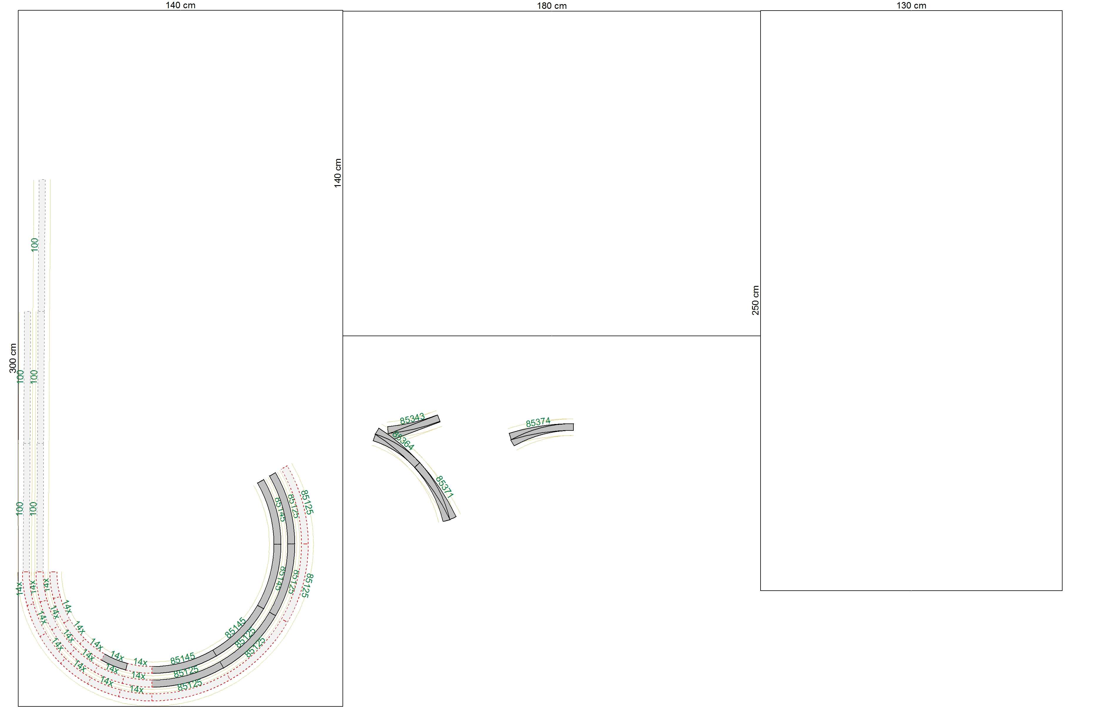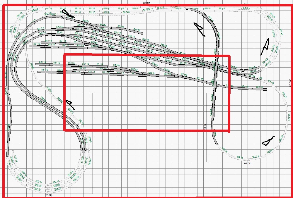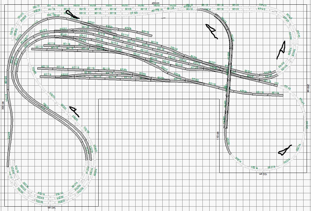 kolejiště jsem řešil dle šikminy v podkroví,tedy opačně než je zvykem.Vlakové soupravy na hlavní trati ve stanici délka cca 250,0 cm.Skica je od ruky.