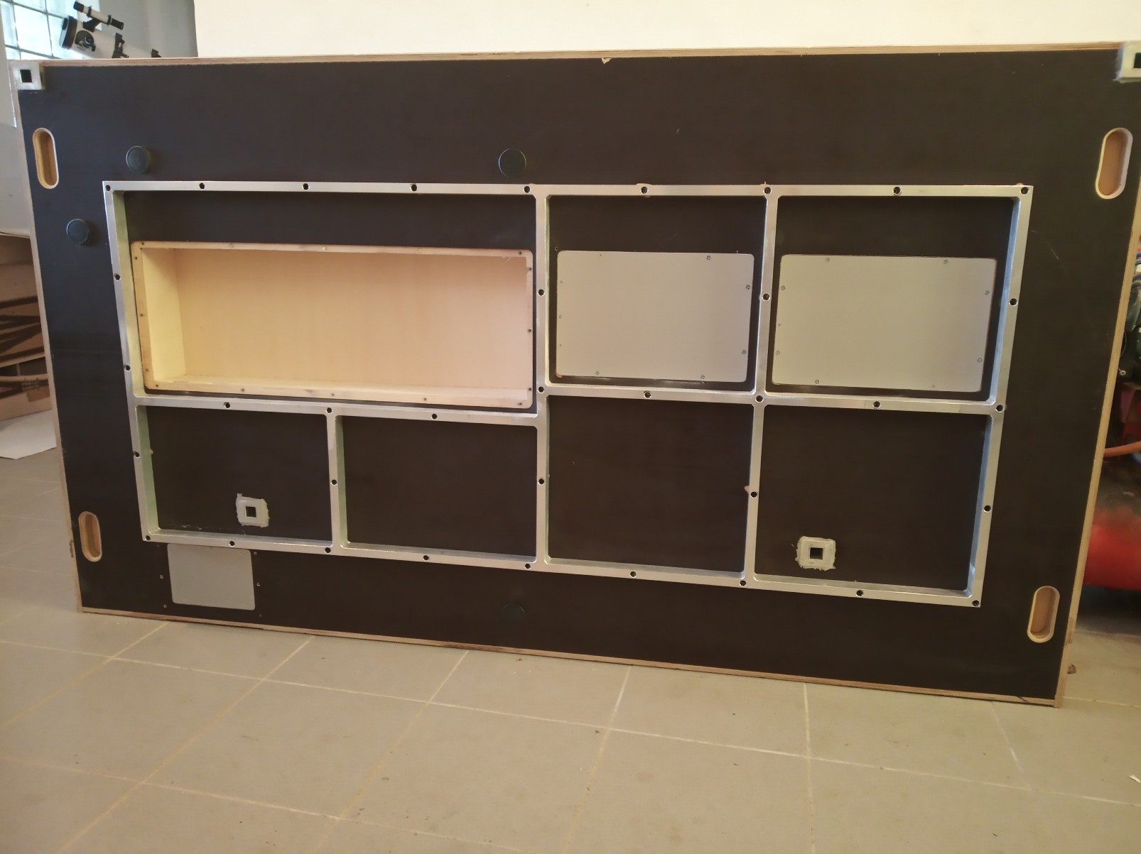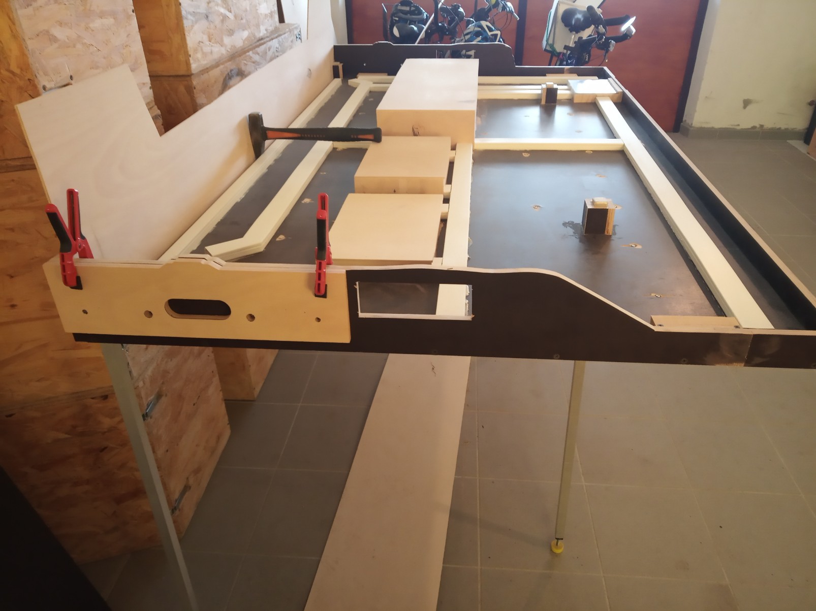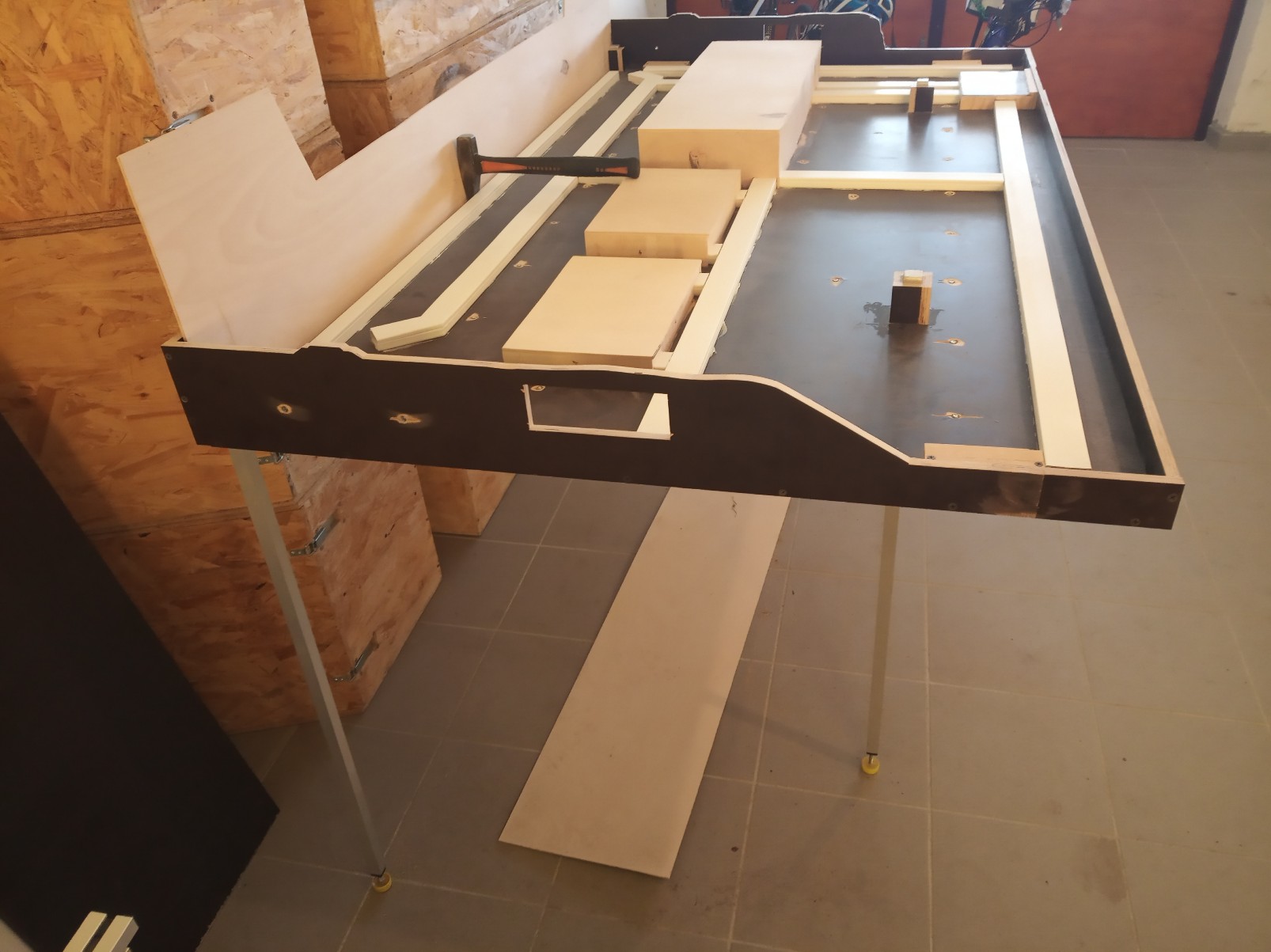 Bohužel se překližkové celoplato ukázalo jako ne moc vhodné, začlo se středem trochu prohýbat. Následně se investor přiznal k vlastnictví technologie a schopnostem svařovat hliník. Proto vznikl pomocný, kupodivu poměrně lehký rám, který eliminoval veškeré průhyby plotny.