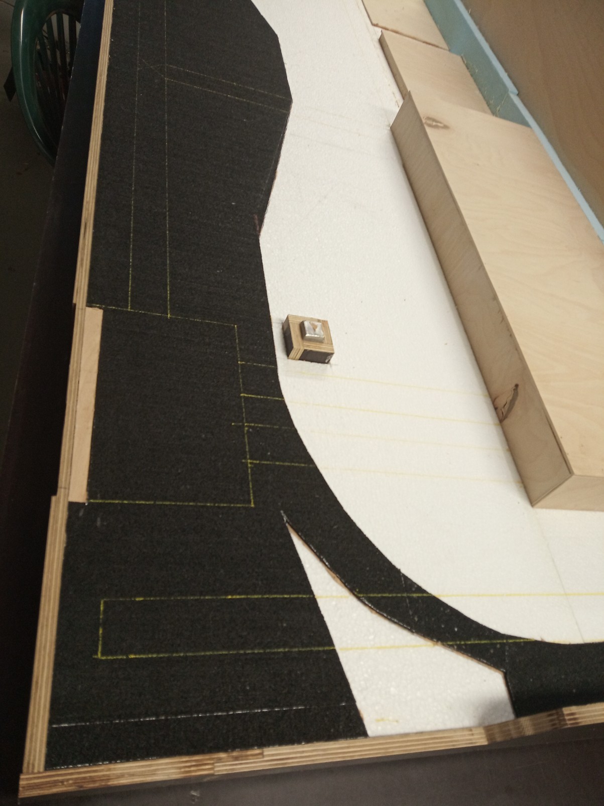 Na základ byl položen polystyren, ve kterém jsou utopené kabelové lišty. Na polystyrenu je nalepená guma a nasucho zkušebně položené koleje.