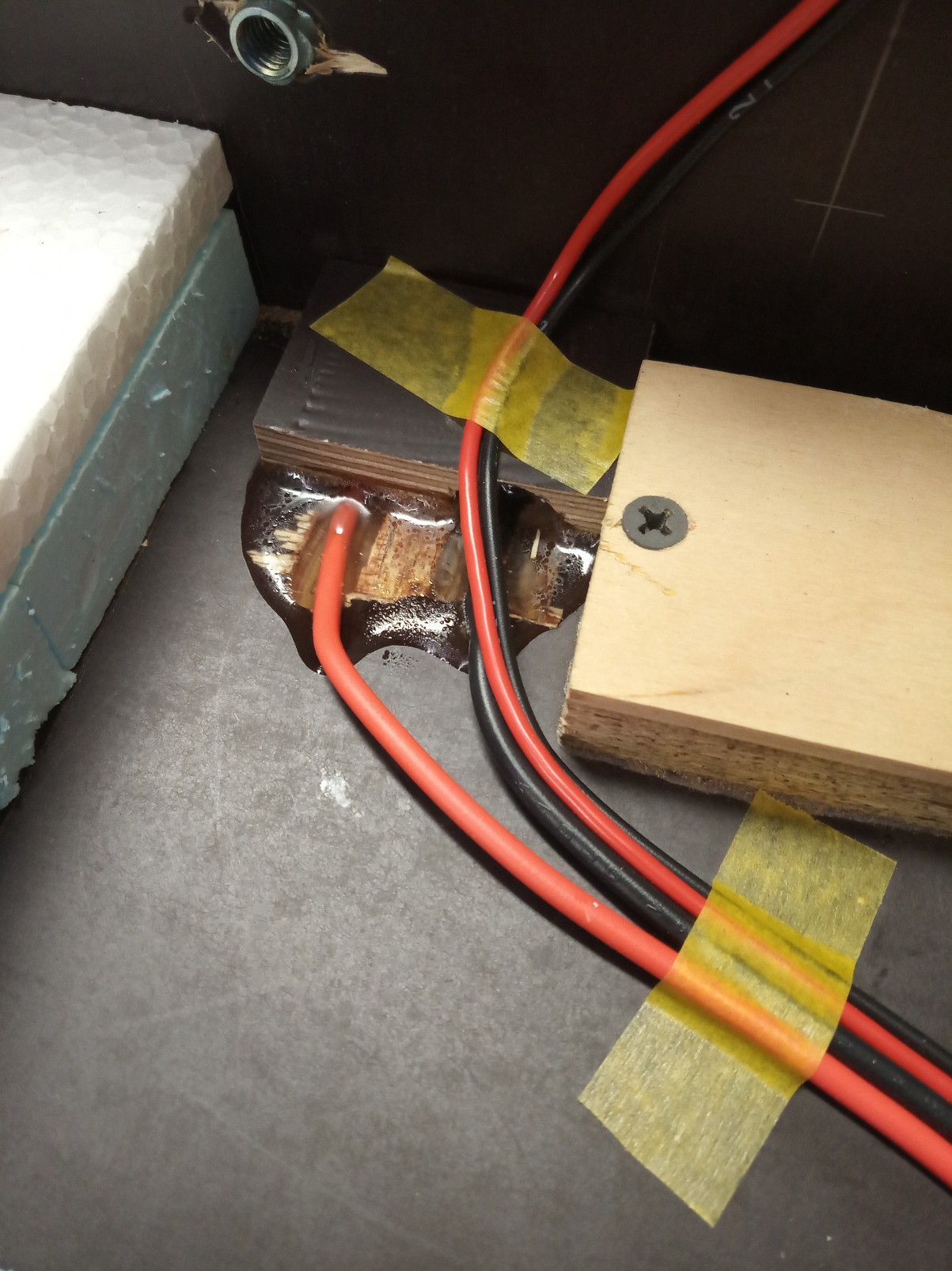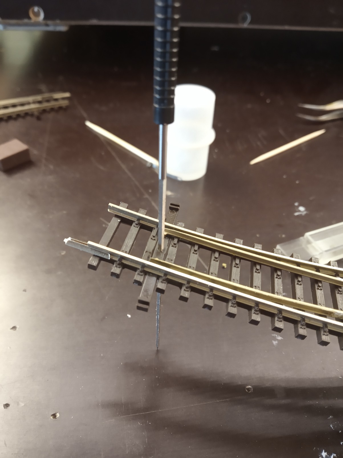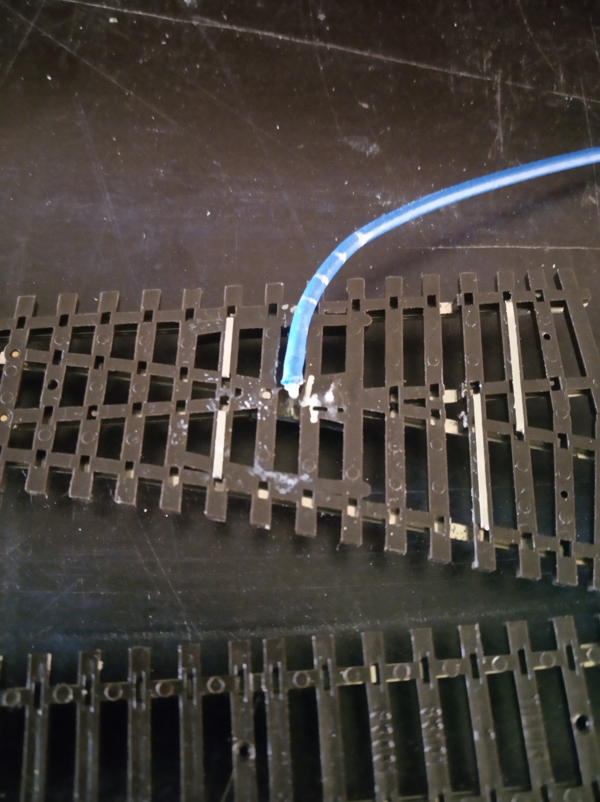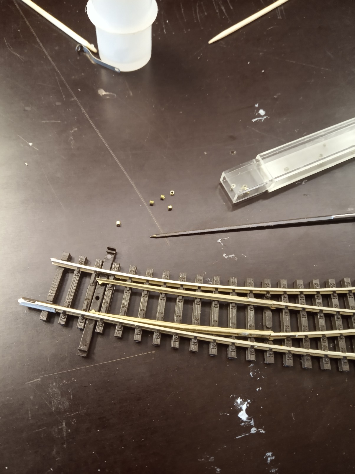 Jsi bystrý pozorovatel Foxi. Ano pohyblivé části jazyků všech IBW a EW1 jsem propojil fosforbronzovou strunkou z vnější strany prutů nepojížděné okolkem. Je to z důvodu nespolehlivosti kontaktu v roznýtovaném čepu jazyku a nedoteku jazyku o opornici vlivem plánované povrchovky kolejí. Letovaný drátek by měl opticky zaniknout pod barvou a patinou. Je pružný a přitom houževnatý. Pohybu jazyků nebrání a lze s touto úpravou použít i originální elmag přestavníky. Jazyky jsou trvale napájené a mají za cíl testovat vozidla, která by mohla na výhybkách způsobovat zkrat. Je to zkušební prvek, který jsme se tam rozhodli ponechat.