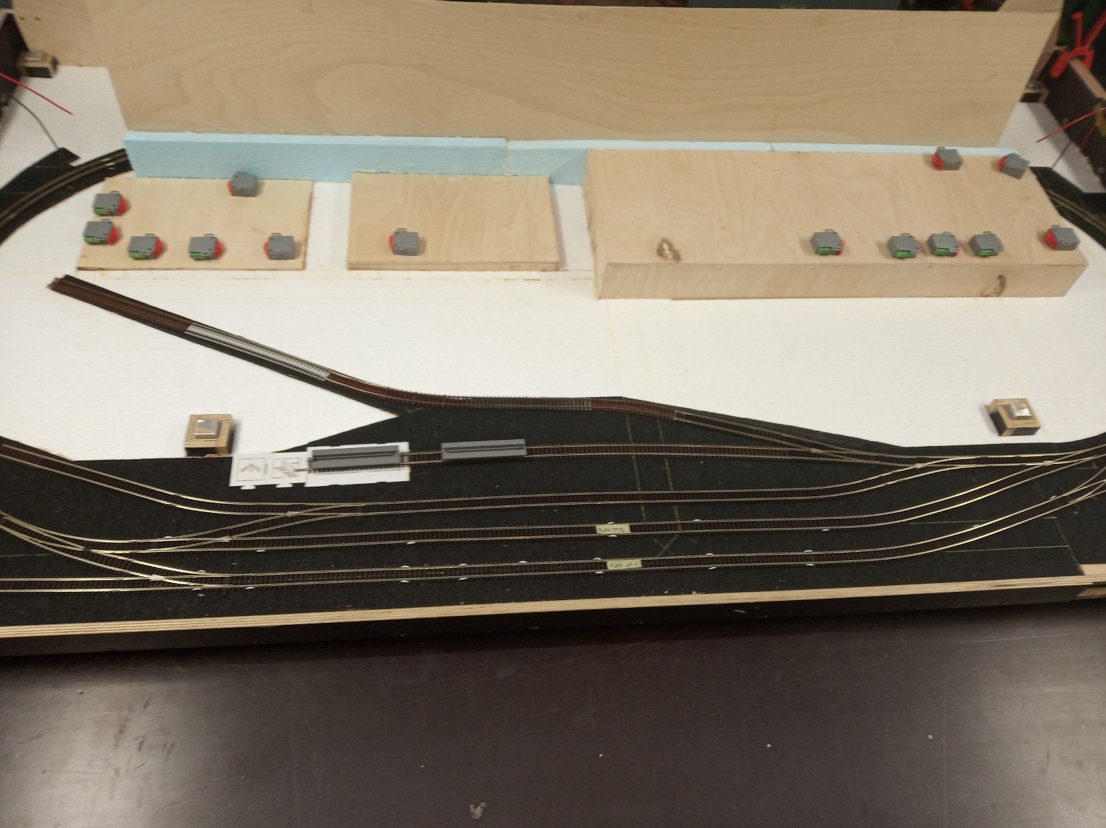 Zhora mám pak trasování lišt zakresleno na gumě i polystyrenu. Do lišt pak budou ze všech přípojných míst staženy vodiče a lištami přivedeny do rozvaděčů pod kolejištěm. V nich budou i přestavníky, které budou s výhybkou spojeny bovdenem. Ale o tom později. Vyústění lišt do rozvaděčů je vidět na druhé fotce.