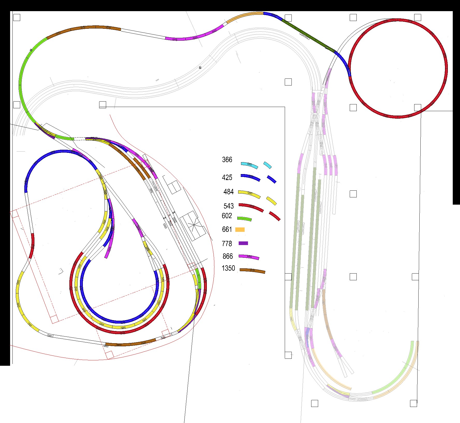 Přikládám náčrtek - jsou tam jednoduché výhybky místo obloukových, odbočení kol. 3 je symetrická výhybka (Y). Doporučuju "flexi" výhybky Tillig, na srdcovce je 9°, ale úhly odbočení jedn. větví je možné upravit dle potřeby např. 3°+ 6°.