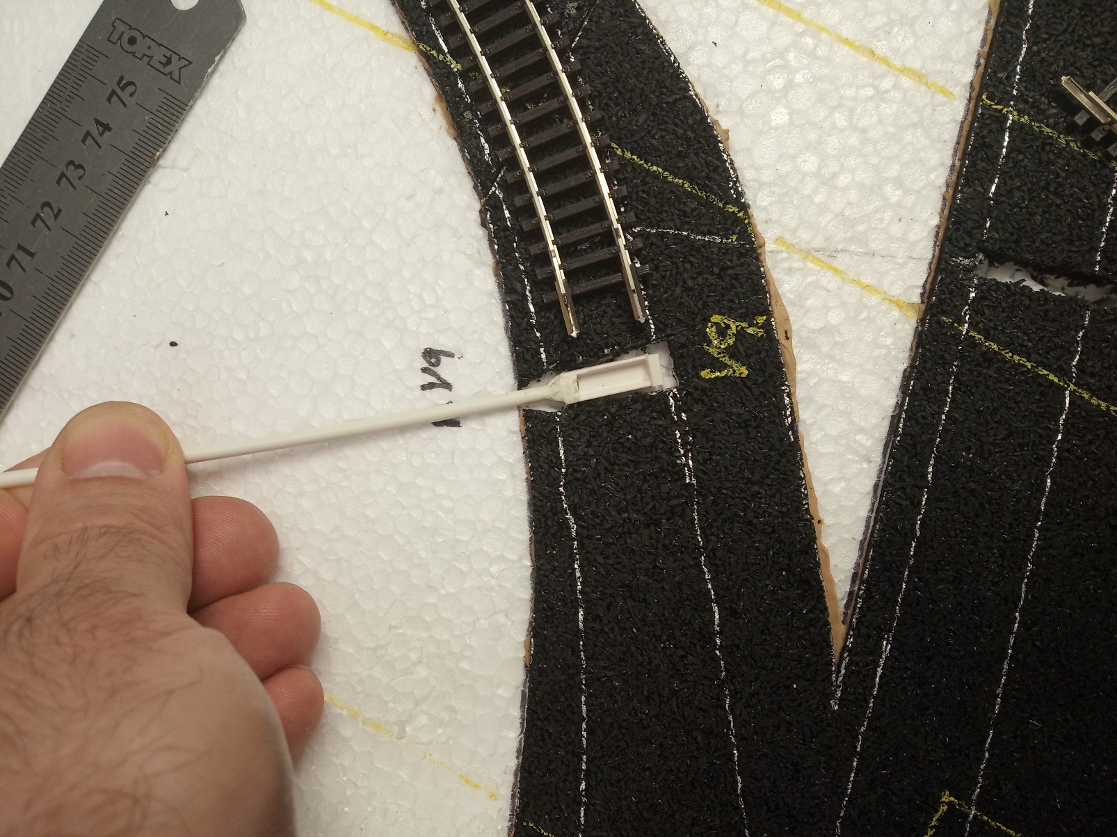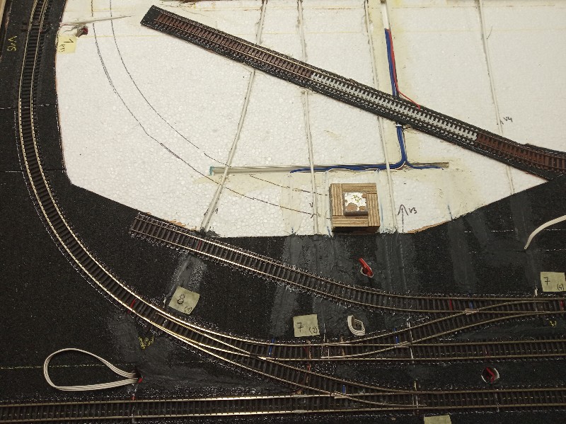 Jinak musím zdůraznit, že na tom nepracuji sám, ale je to kolektivní práce.Ještě jsem zapoměl. Vlečka ke kamenolomu je složena ze všech dostupných typů kolejiva filigran. Zbytek tratí je pak kombinován kolejivem Tillig, Litomyský a Kuehn, a to kombinace standard a flexi. Je to z toho důvodu, že kolejiště bude mimo jiné sloužit jako zkušební okruh pro stavěná vozidla.