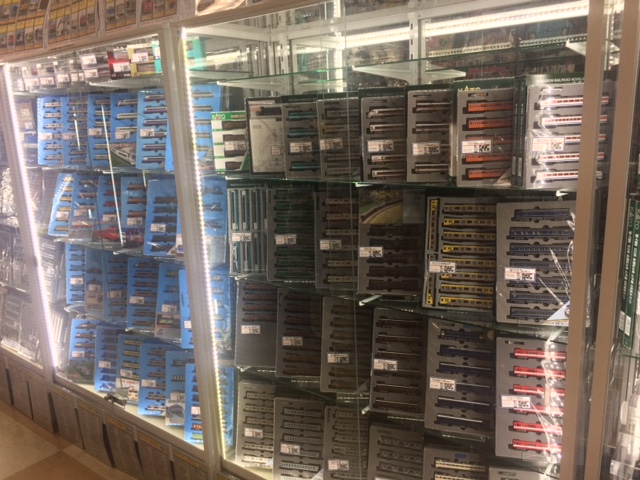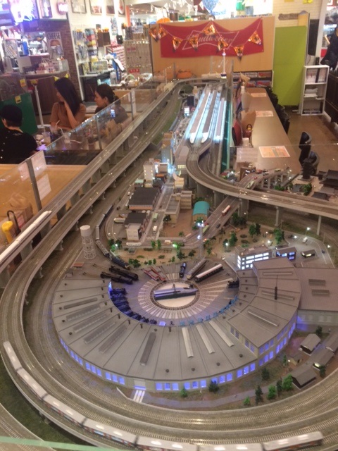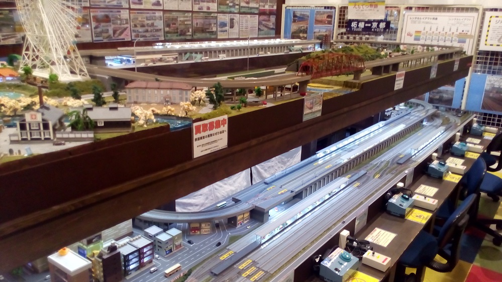 Tak tohle se mi líbilo. To je super marketingový tah, udělat v Kyotském obchoďáku vláčkovou restauraci (Hned u Shibkanzenového nádraží). Je tam několik kolejišť a mezi tím stolky na jídlo, děti alespoň moc nezlobí a sledují vláčky, či běhají okolo, ochmatávají plexiskla a čučí na to. Kousek od toho je samozřejmě vláčková prodejna, ale zaujalo nezaujalo mne u ní jen to, že jsou dvě kolejiště nad sebou, ale že si také volají jak na modulovkách, jen ty židličky jsou na husto. Tady prostě s místem to není zrovna nejlapší. Jede se tu v drtivé většině velikost N. H0 se téměř nepotká. Všechno téměř Japonsko, najde se nějaká amerika, z Evropy toho moc není.
