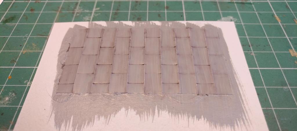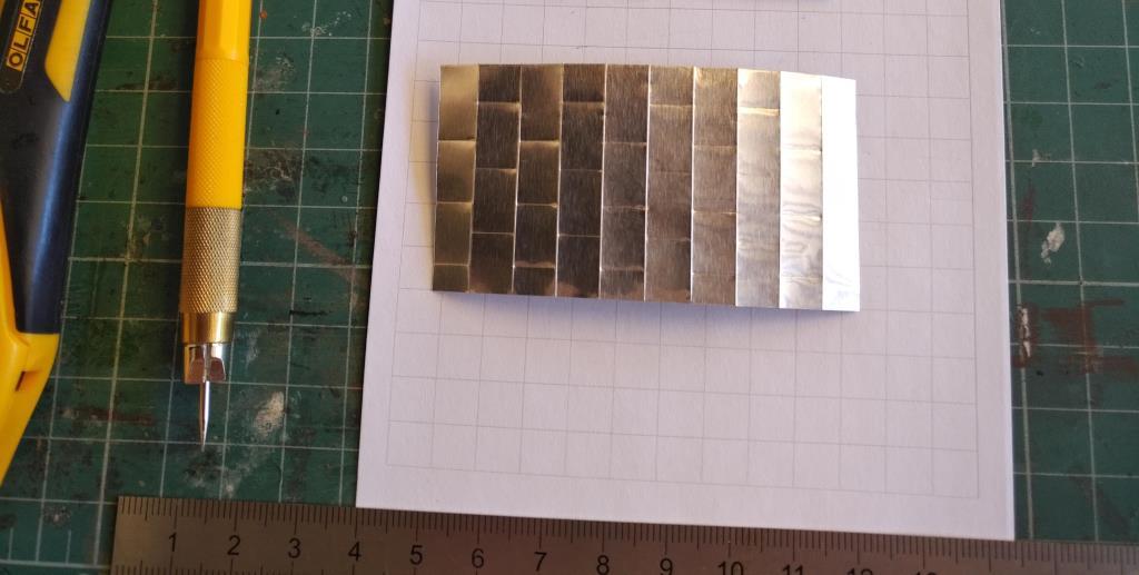 K přístřešku: chtěl jsem jednoduše tři cihlové omítnuté stěny (leckde opadaná omítka) a plechová střecha. Přemýšlel jsem, jak tu střechu udělat. Nakonec jsem vzal tvrdší Al fólii z grilovací misky, pertlování jsem naznačil z rubu rytím jehlou (při správném tlaku se to dostatečně protlačí na líc), jednotlivé plechy pak rytím z lícové strany. Protože se to kroutí, podlepil jsem to celé nakonec tenkým kartónem (vodovzdorným lepidlem). Je to první vzorek, není hotová patina, byl jsem líný špinit airbrush tak jsou vidět stopy od štětce. Taky barva špatně drží, příště bude potřeba ještě před rytím fólii lehce přejet jemným smirkem. Ale zdá se, že to je dobrá cesta. Anebo aspoň vidíte, že se nenudím. :lol: