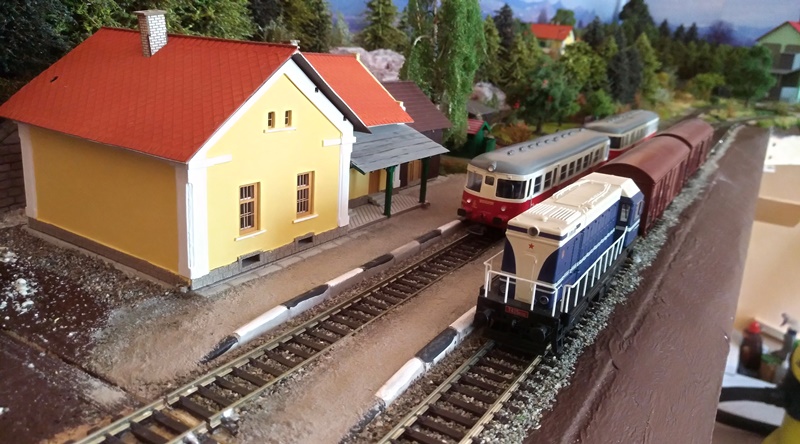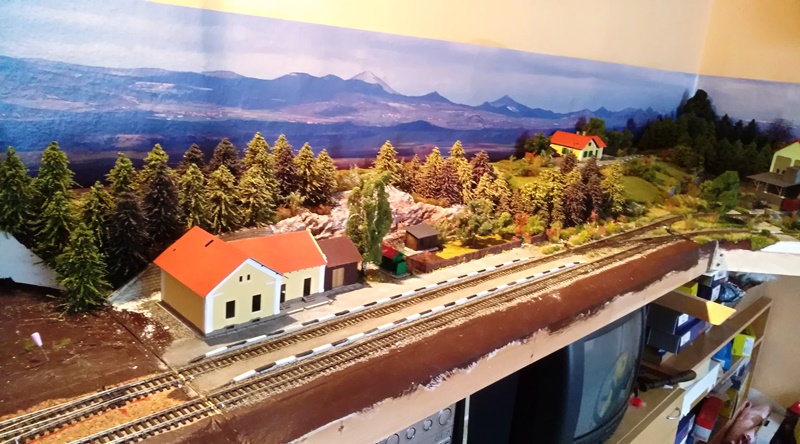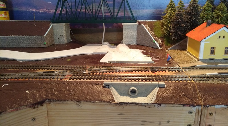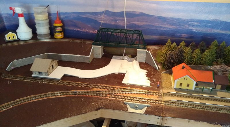 V podstatě dokončena staniční budova mezilehlé stanice - chybí pouze žlaby, svody a desky s názvem stanice. Práce se tak pomalu přesouvají na další segment. Zde jsem si ještě navíc vymyslel strouhu. Tak jsem ji dnes "vybagroval" a vznikl i malý propustek pod tratí. Vlevo na kusé koleji mám zatím pouze položené skladiště co mi zbylo, ale uvažuji, zdali by nebyla lepší pouze volná skládka, např. uhlí a stavebnin, jak to bylo běžné v 70.-80. letech. Co na to kolegové? Předem děkuji na názory, nebo nápady, na co využít tu kusou kolej. :wink: