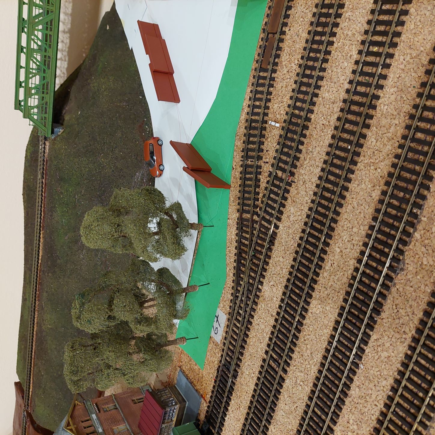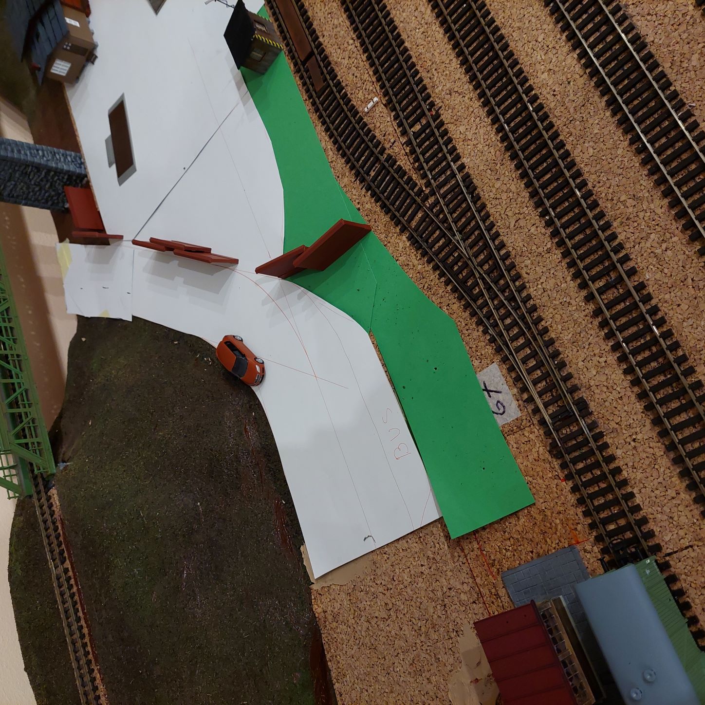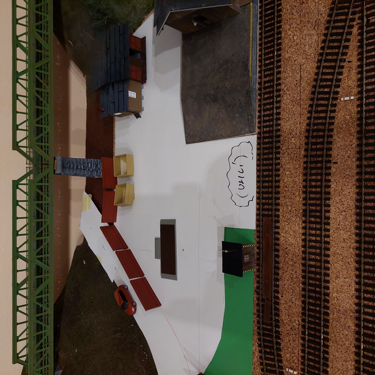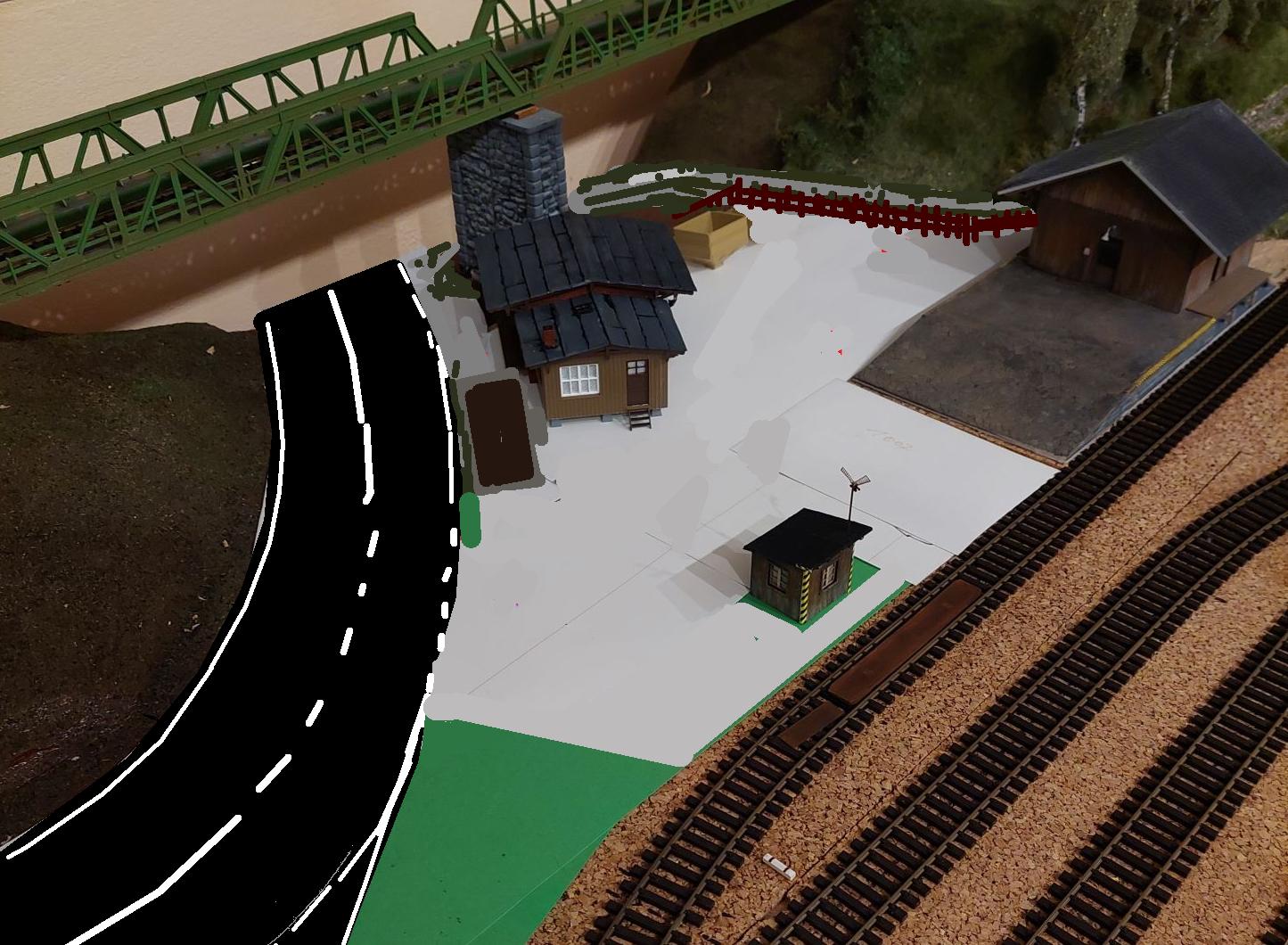 Cesta ke strážnímu domku u mostu za nádražím... trochu nepřirozeně na mě působí už jen to že tam vede cesta od nádraží, a podle posledních fotek bude přes uzavřený alreál skladu u nádraží... asi bych se cestu pokusil vést aspoň kolem skladu někam pod most, za plotem skladu stromky které by to ještě trochu víc oddělili... i to by aspoň trochu opticky oddálilo strážní domek i zadní trať od areálu nádraží. Asi by se dala cesta směřovat dál do kopce ned tunel aby nekončila jen u strážního domku jako kdyby tam byla jen kvůli němu.