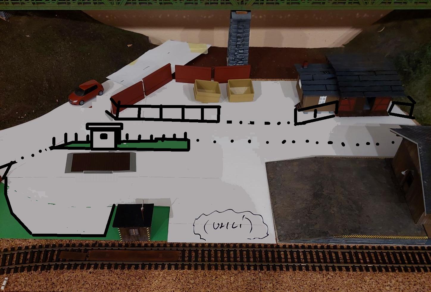 Co třeba nějak takto jak jsem zmínil už dřív cesta ke strážnímu domku až za oploceným areálem, na silnici by se mohla napojit treba hned za mostem aby bylo vidět nvazující turisické značení už od nádraží. Malou přístavbu skladu kde by se to překládalo na aouta ba se dalo zrovna využít i jako budovu od váhy, jen by asi nebylo vhodné aby byla před štítem budoby kde by lezli přímo ze dveří na váhu, z boku by asi vypadala přirozeněji...