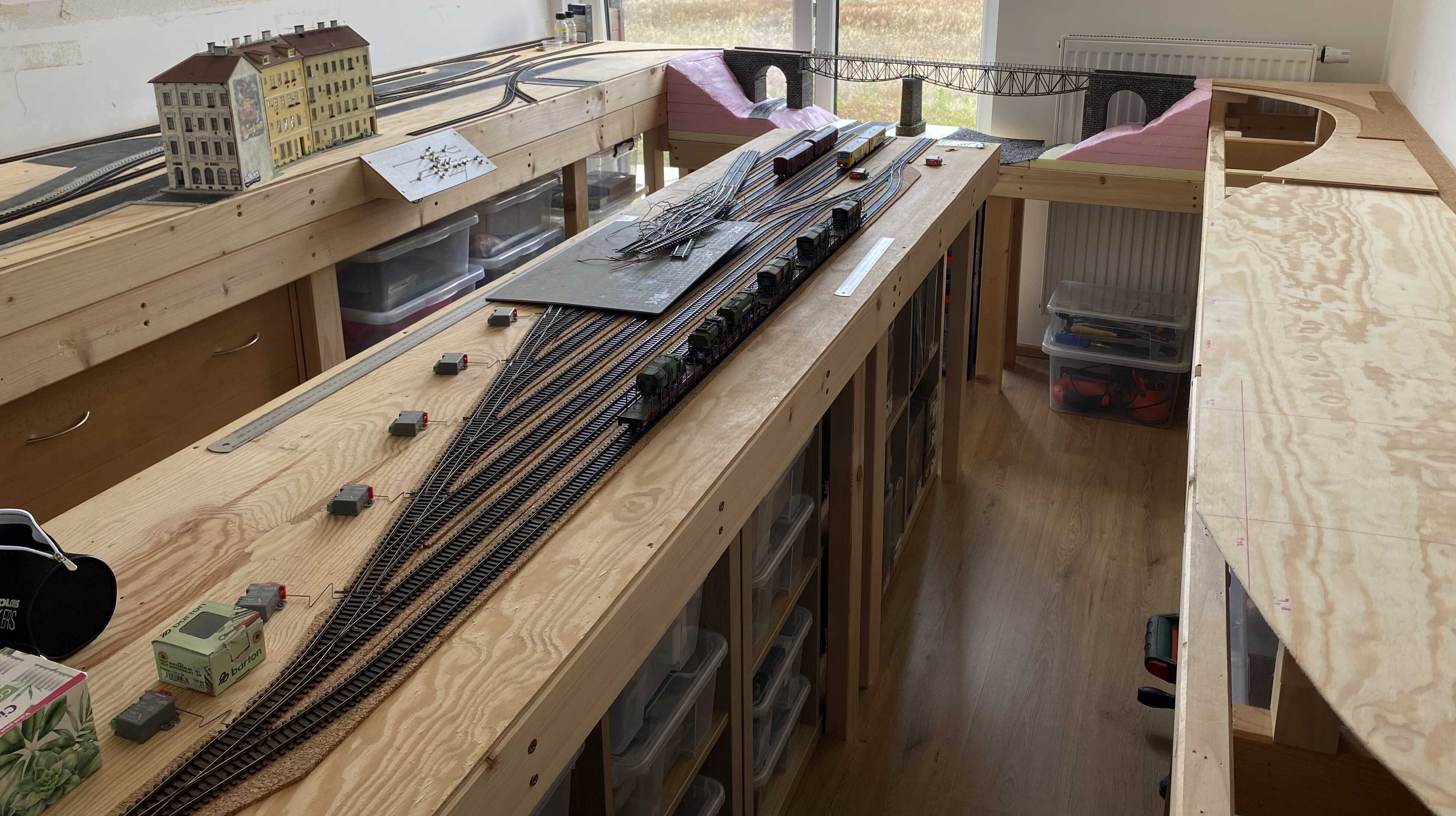 Tak po dovce jsem se zas zaradil do modelarskeho procesu a rovnou do truhlariny. Konecne jsem opustil Tabor a zacal pracovat na prave strane kde bude za mostem odbocka Dolina, ktera ve skutecnosti slouzi vojenske vlecce, ale me poslouzi jako sjezd do SN. Pokud vsak odbocku projedem primym smerem dostaneme se do Sudomeric. Drevo mam za sebou tak prichazi cas na korkovani, predvrtavani a pokladku koleji