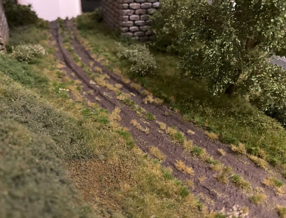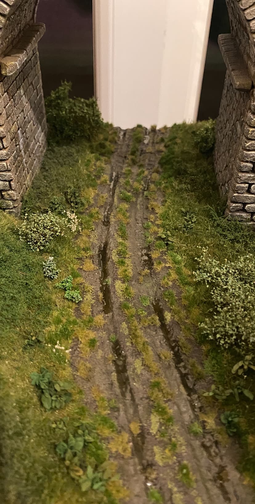 Tak konecne se cesta blizi vysledku co jsem chtel. Vcera jsem na rozbiti barvy strukturove pasty pouzil zemite efekty, a wet effect. Do nejvetsich propadlin jsem vyuzil AK puddles, ktere imituje spinave louze. Puvodne jsem chtel hrany prechodu mezi zeminou a travou drybrushovat, ale pri tehle vlhkosti to delat nebudu. Ted me cekaji kratke kere a plevele kolem a taky se vrhnu na zelen ve svahu plus tu strouhu u silnice. Taky jsem stihnul privrtat desku pod Sudomerice a polozit koleje odbocky Dolina