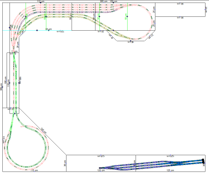 Poloměr tobogánu je 396 a smyčka (zelená) je 346 .Jinak ten pohled bokem budu mít taky , takže něco malej uvidí i po dostavění horní koncové stanice.