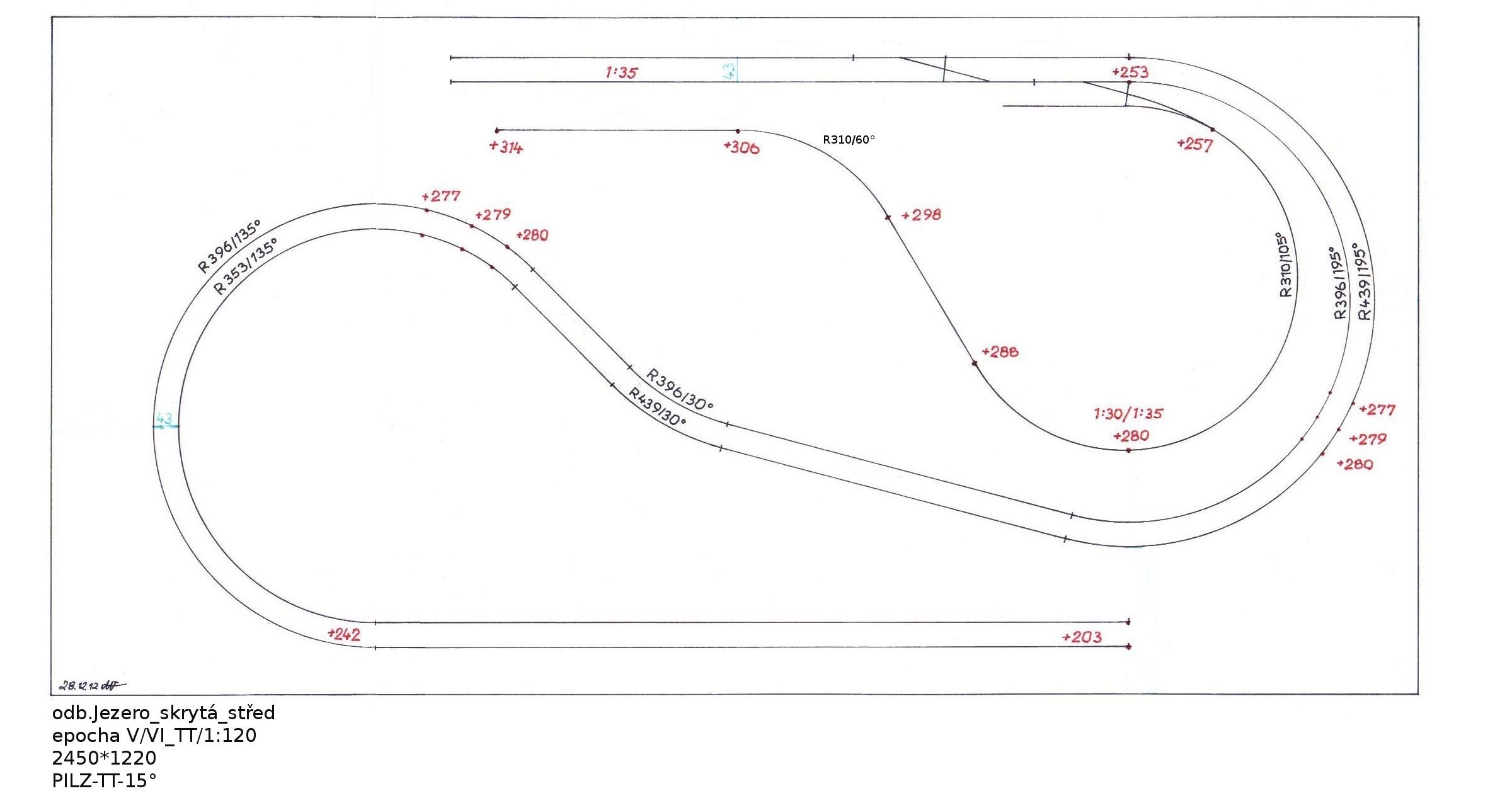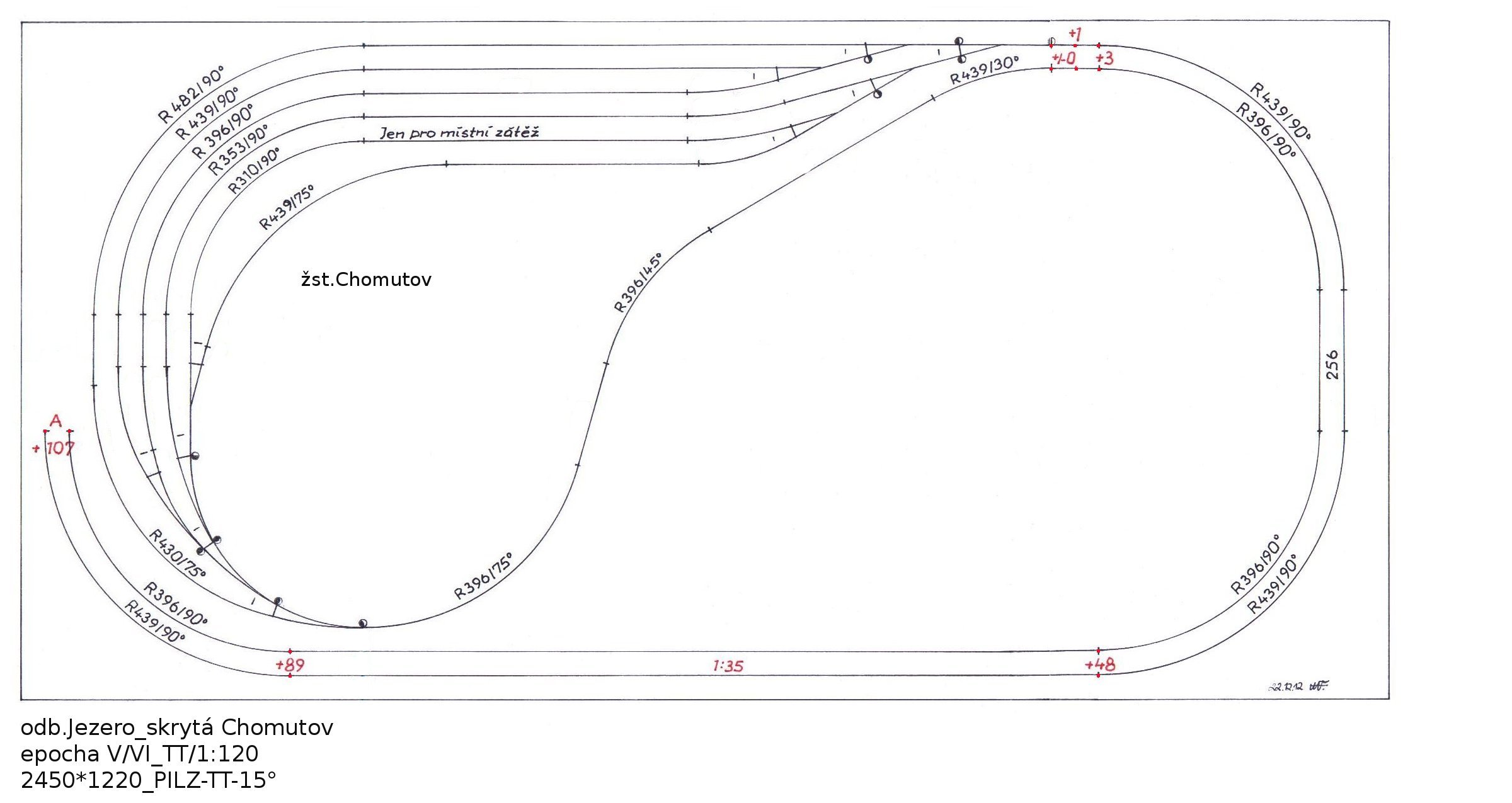 Trochu jsem ještě upravil ten předchozí plánek - staniční dopravní koleje teď mají užitečnou délku 140 cm. Poloměry jsou (2-1-3-5 = R550-R600-R643-R686). Minimum je R353 v "esíčku" a ve skryťácích. Na dvoukolejce je ve viditelné části R500-R543, ve skryťácích R353-R396.