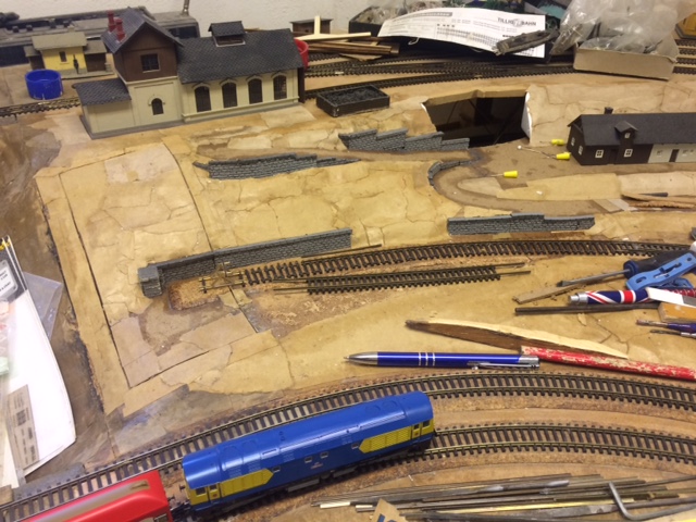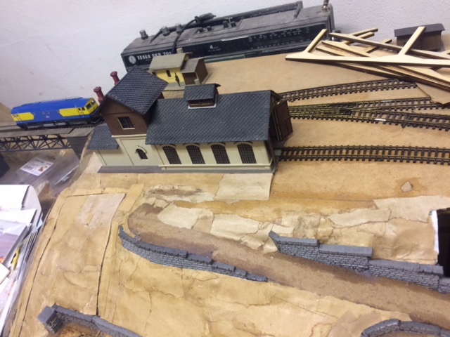 Také jsem konečně zakomponoval výtopnu do kolejiště, přidal jsem ještě jednu výhybku, šturc od Igry je fajn. Doplnil jsem kratší verzí jámy, vytvořené z těch, co jsem dal ke stažení k dispozici. Zapájel jsem si při tvorbě zauhlovacího zařízení, které tam jen stojí, aby nedošlo k jeho poškození díky pracem v jiném místě, nebude zde součástí. Konstatuji, že stavebnice je zbytečně složitá a bylo ji možné udělat jednodušejí a vypadala by stejně, zbytečné vrstvení dílů mne nenadchlo.