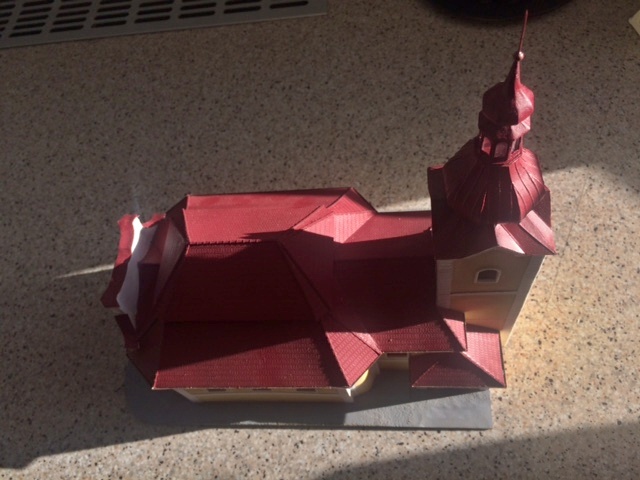 Několikrát jsem stavbu upravoval, pohrál jsem si více se střechami, i proto, že podklady z vysřihovánek nejsou přesné skutečnému rozložení hmoty (ještěže dnes se můžeme na mnohá mista letecky v mapách podívat, abysme se inspirovali, či si něco potvrdili), jak jsem si myslel a je to velmi přibližné. Takže doporučuji si dané věci, či prvky zkusmo slepit, posoudit jak se to líbí a potom tu stavbu případně upravit, překresli a pak stavět našimi kartonovými technologiemi. Nejspíše vznikají vystřihovánky z velké části podle fotek, kde to účelu vyhovuje. Budu zase chvalořečit možnosti computeru a grafiky. :-) Báni věže jsem dělal 3krát, než se mi tvar a velikost líbila a není jen z papíru.
