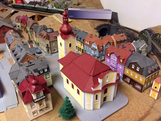 Zde panorama mého městečka, které se pořád rozrůstá. A druhé malinko jiné zakončení věže skončilo na řadovém koncovém domě z krabice Auhagenu a zbylých okýnek různých stavebnic (zábradlí na balkonku je humpolácké, časem jej nahradím nějakým jemnějším, až se něco naskytne), je vidět i další rohový dům z roky starých zbytků a náhodné tvorby. Tedy udělal jsem ještě dva a další stavby. Jen ta fotka není vypovídající a již se mi to nechce přefotit, tak někdy příště...