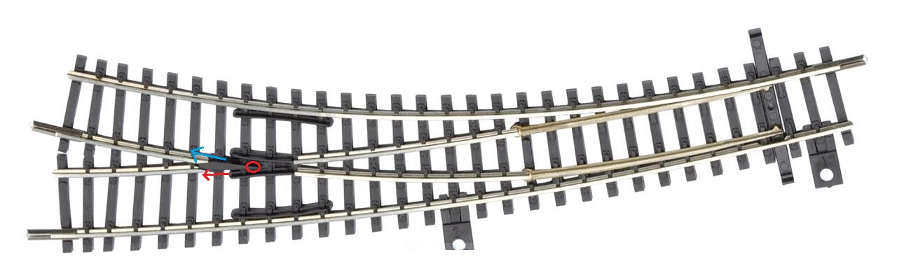 Mám položenou část kolejí. Včetně dvou výhybek. Zatím přestavuju ručně, i když přestavníky s jejich dekodérem už mám nastaveny a připraveny na montáž. To ale asi není moc podstatné pro můj nový problém. Zatím jsem to projížděl samotnou lokomotivou a až na jednu vyjímku v pořádku. Jde o to, že na jedné výhybce v jednom směru mi lokomotiva ve většině případů vykolejí. Mám MTB brejlovce. Nový, najezdil zatím jen maličko. Pokusil jsem se to zakreslit do obrázku: