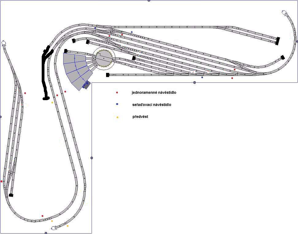 pochopil jsem, že budou použita mechanická návěstidla. Při rychlosti 40 km/h v celé stanici bych udělal osazení podle obrázku. Odjezdová návěstidla jen dvě na každém zhlaví (každé pro jednu skupinu kolejí, odpovídající příslušné trati). Seřaďovací návěstidla jen u výjezdu z výtopny a pro povolení posunu na vlečku. V mezilehlé stanici na "lokálce" jen jedno skupinové odjezdové návěstidlo na každém zhlaví. A i tady se předpokládá 40 km/h v celé stanici, jinak by návěstidla musela být dvouramenná (nebo by mohlo být vjezdové návěstidlo světelné ž-z-č-b-ž, ovšem bez rychlostní soustavy - i takové kombinace se vyskytovaly). ...