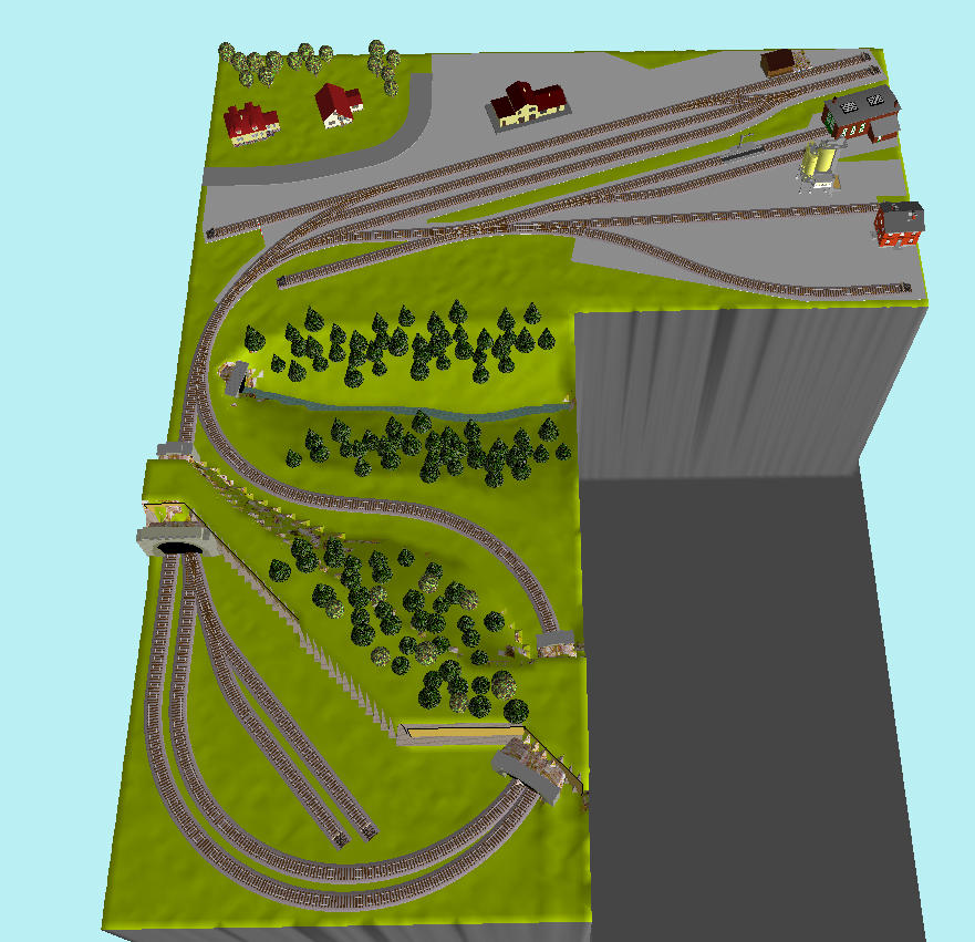 Když na to tak koukám, přijde mi jako moc kolejí ve stanici, asi by bylo lepší zredukovat, stanici,, ohnout,, směrem k vesnici a upravit záhlaví, aby koleje vycházely rovně v místě napojení segmentů. A dále holt upravit oblouky a SN.