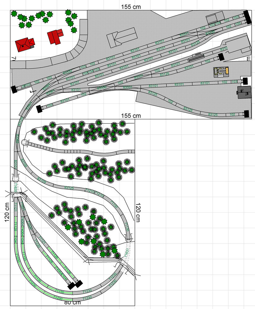 Další návrh? segment s nádražím prodloužen o 15 cm, výhybky už nejsou na přechodech, ze stanice vedou dvě vlečky a kolej pro remízu. Jedna vlečka ze širé trati.