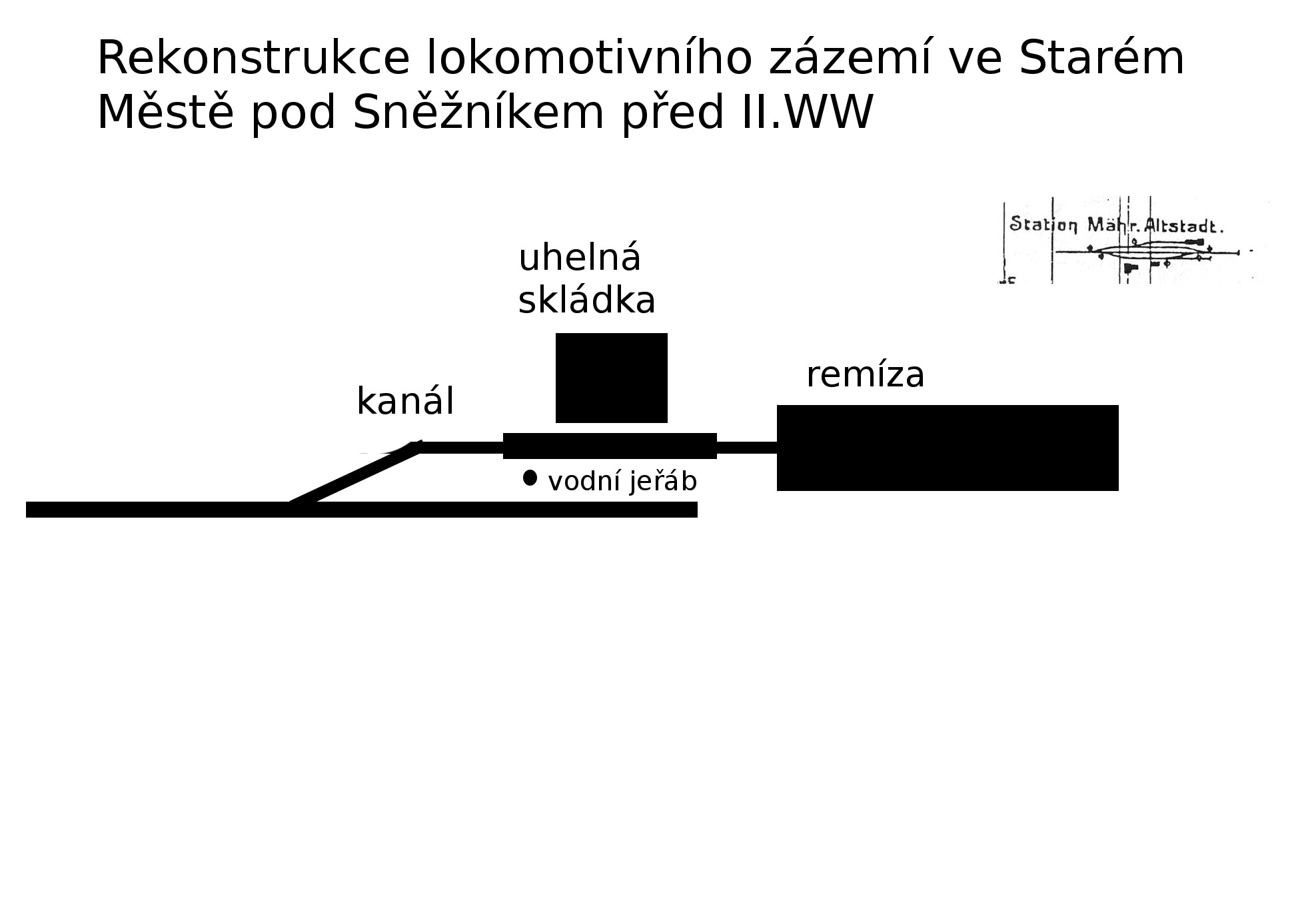 hank píše:Varianta II bude asi správně. I na jedné z těch fotek je vidět něco jako svislý stojan vodního jeřábu hned za výhybkou, zatímco uhlí až před vraty. A ten vodní jeřáb podle té fotky byl asi na druhé straně koleje než ho máš nakreslený. Na délku se tam vešlo všechno pěkně za sebou: Remíza 31 m, uhlí 7 m, kanál 17,4 m, celková délka 5. koleje od námezníku k zarážedlu podle starší varianty staničení z konce 90. let 20. století (starší podklad nemám) je 88 m (dnes je o 5 m delší).