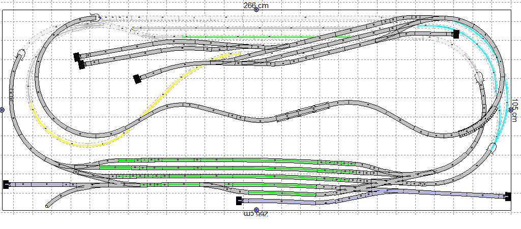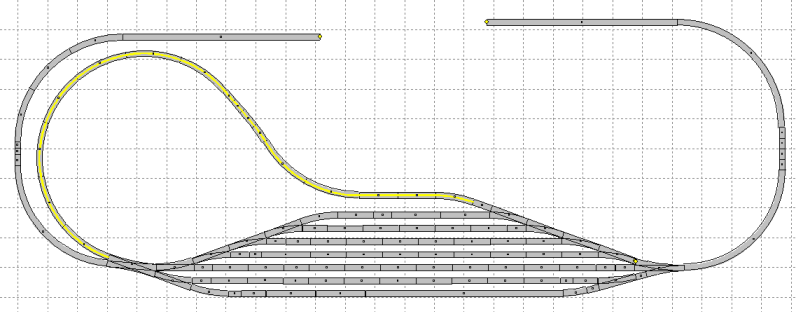Myslím, že jsem našel optimální a elegantní řešení skryťáku. Jednu průjezdnou kolej budu potřebovat vždy - vlak jede dolů do smyčky z odbočného nádraží z úrovně 0 a aby se tam vrátil ze stejného směru, musí se v SN otočit. Uspořádání v úrovni 0 umožňuje i jízdu dokola, ale to nemá dopravní logiku.