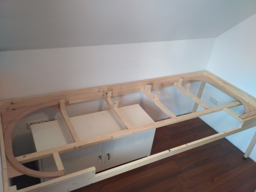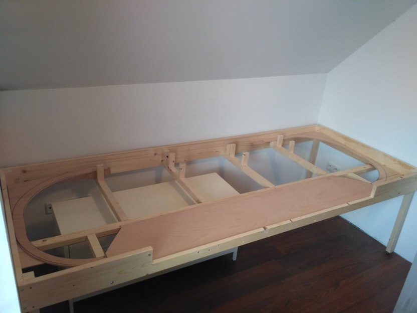 Vrátil jsem se o krok zpět a upravil zásadním způsobem rám. A to tak, abych mohl jednoduše zespoda vyndat desku se skrytým nádražím. Původně rám dovoloval její posunutí do jedné nebo druhé strany v podélném směru, což jsem vyhodnotil pro stavbu a servis dvou nádraží nad sebou jako nedostačující. Nyní se jen lehce nadzvedne, naklopí a může ven. Také jsem udělal desku úplně novou, z překližky buk 8 mm. Původní byla jen 5 mm. Ne že by těch pár kolejí neunesla, ale jaksi se začala svévolně prohýbat do luku. Takže to jsou moje dosavadní poznatky a zkušenosti. Rám kolejiště je na svém místě, o to složitější manipulace s ním při úpravě byla. Asi jako s ježkem v kleci.