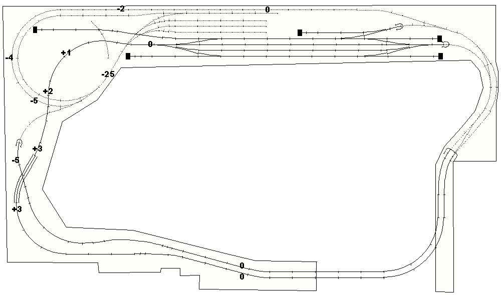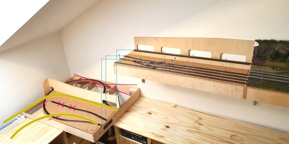 Nivelita je OK. Resp. není OK, ale vzadu trať trochu klesat může - na levém modulu stanice nemám krajinu, tak holt vezmi pilu a frézu a tu skrytou trať odříznu od základový desky a násilím ji ohnu do klesání.. Pak ta první otočka pod viditelnou trať vyjde. Trať vjíždějící do SN od okna se může napojit až do druhé/třetí otočky spirály, to je jasný.