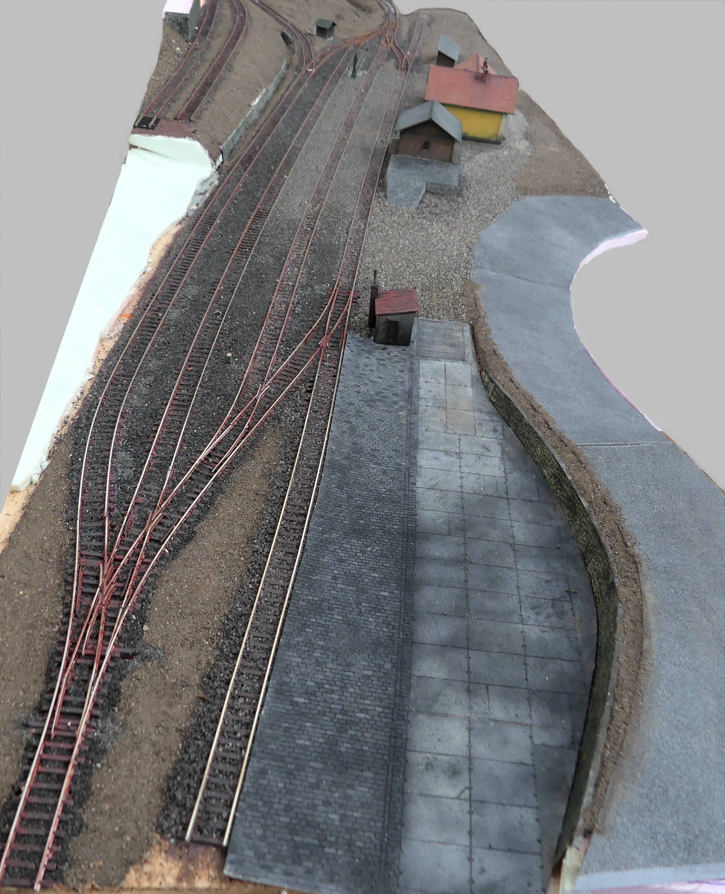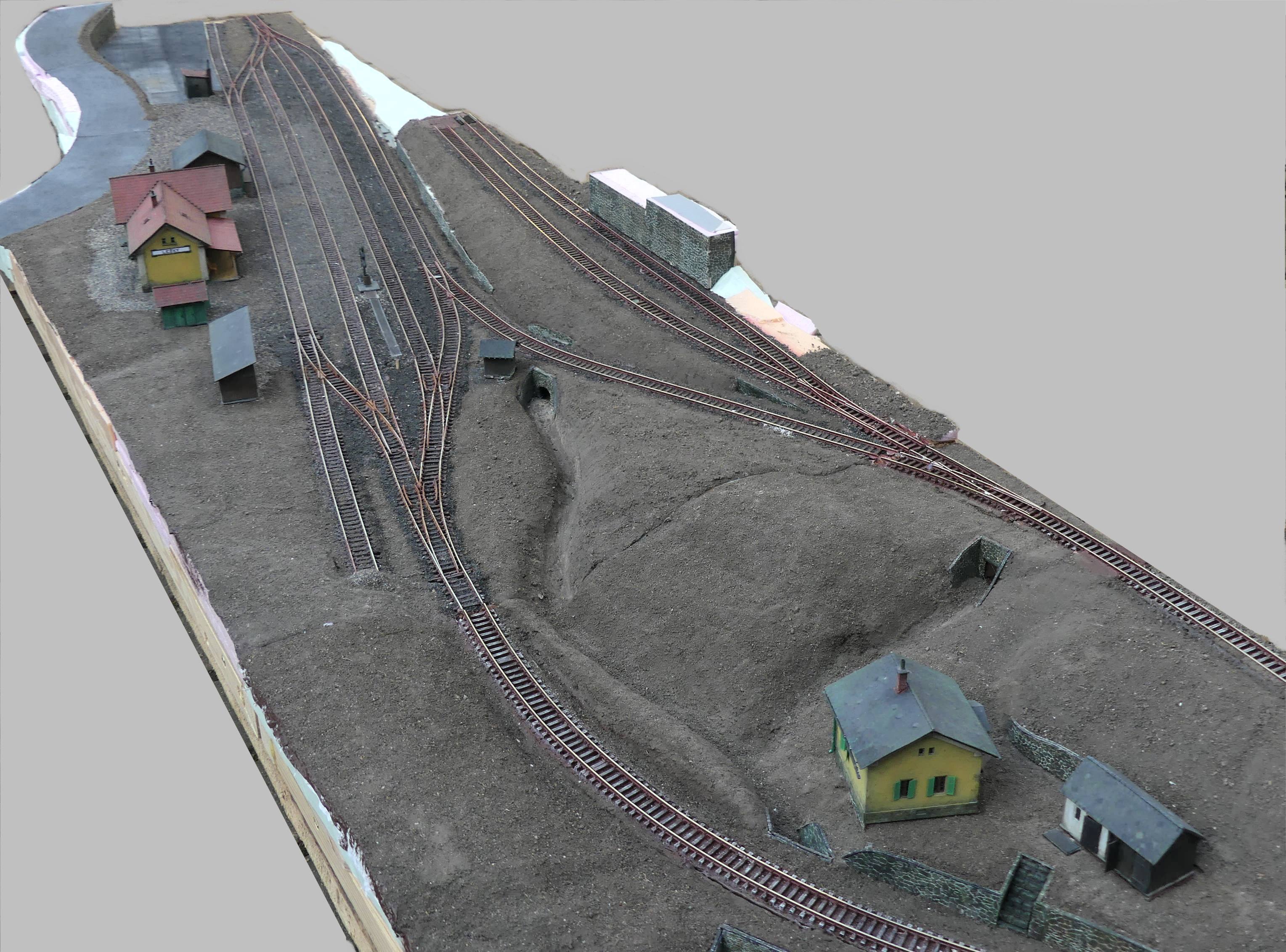 To klesání svahu z horní stanice do úrovně terénu spodku má nějaký důvod? Jen že bych ho tam nedělal a přidal tak víc místa kolem budov v horním nádraží. Pak by se ta cesta nemusela tak mačkat k budovám, které se zase mačkají ke kolejím.