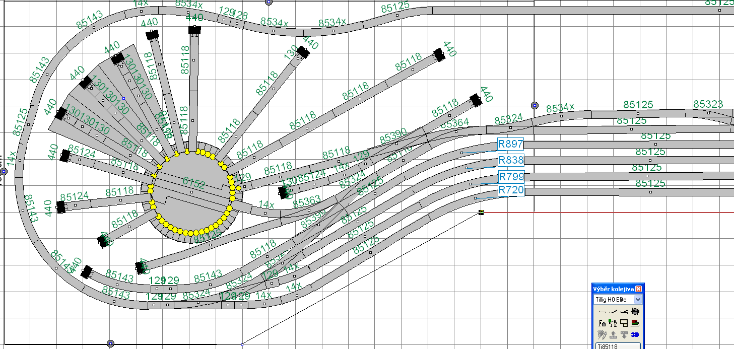 Udělal bych větší poloměry oblouků ve stanici, aby začínaly vpravo na hraně segmentů.