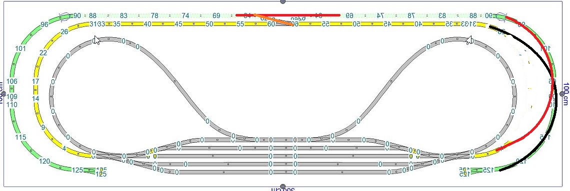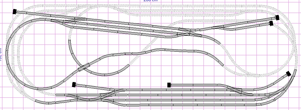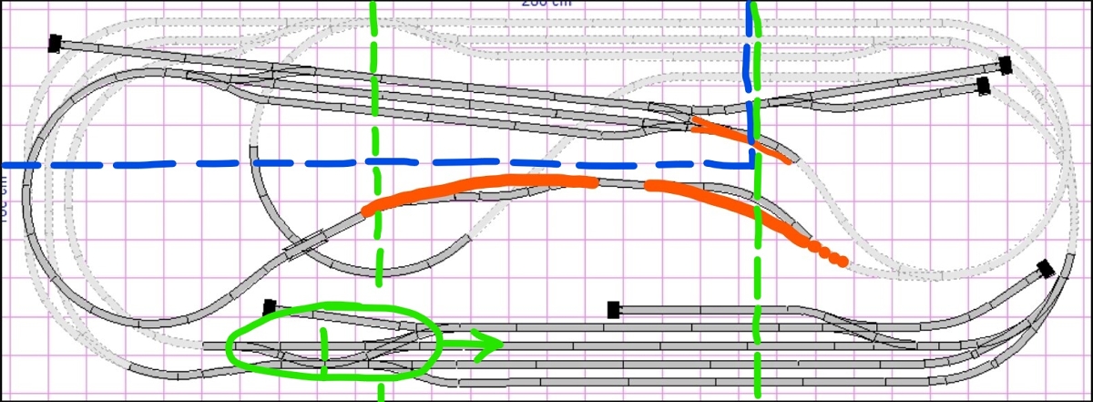 Myslím si, že zde je hlavní myšlenkou provoz na vedlejší trati do odbočné stanice (v návrhu skryťáku není řešena), lehce doplněný o provoz na hlavní trati. Podle mě tedy nevadí, že souprava jedoucí na hlavní trati není moc vidět. Navíc, díky tomuto uspořádání se mohou na hlavní trati alespoň na chvíli objevit i soupravy, které by se na vedlejší trať vyloženě nehodily a tudíž by je nebylo možno na kolejišti provozovat.