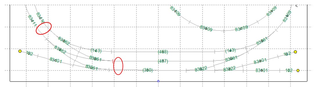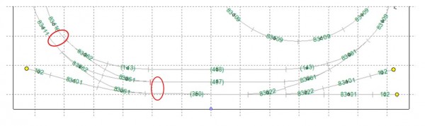 No nevím... zkusil jsem upravit levé zhlaví tak, aby byl přístup z odbočky (aspoň) na dvě koleje. Nějak mi pořád nevychází geometrie a nevím, zda to je chyba Wintracku (nebyla by to výjimka), nebo to skutečně nevychází. Viz obrázek, v červeně vyznačených místech nejsou dodrženy rozteče 43mm. Pokud to je pravda, tak by se musely použít vložené malé kousky kolejí a celá "elegance" řešení by byla v trapu. Ověřit by se to dalo jen poskládáním ze skutečných výhybek a změřením... Asi mi teď nezbývá, než se kolegovi "dansemacabreˇ" omluvit za plevelení vlákna, fyzicky výhybky nemám :(