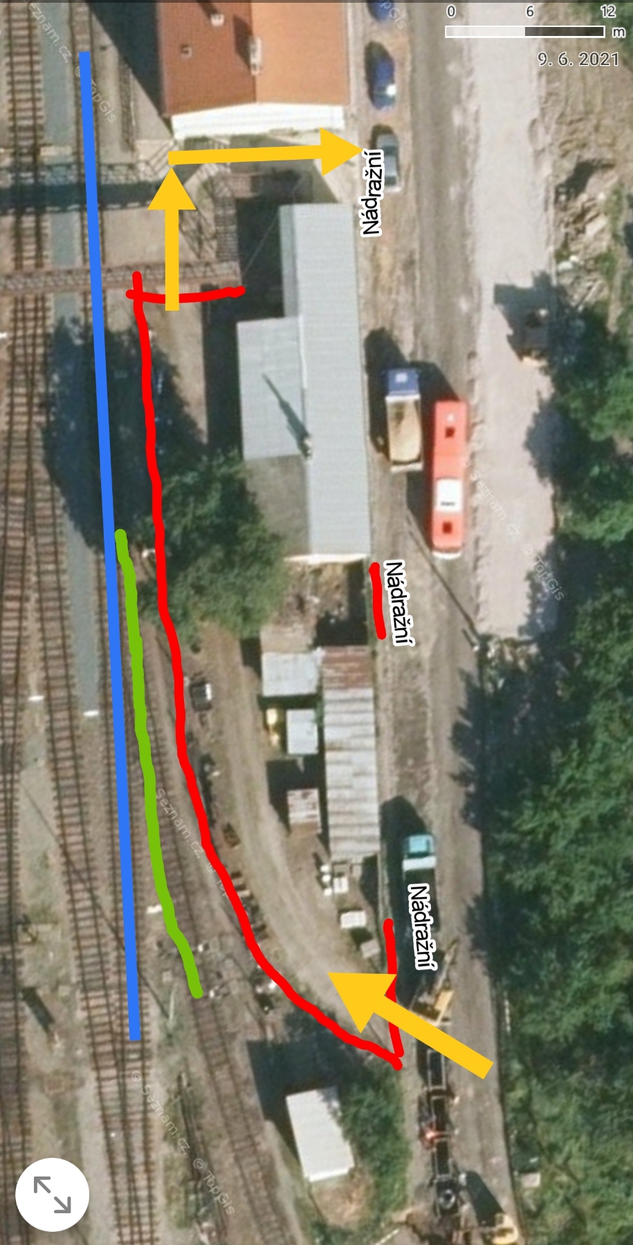 S výhradou k traťovce nesouhlasím. Např. zrovna v Hrušovanech nad Jevišovkou má traťovka dílny a vůbec celé to svoje provozní „vetešnictví" pěkně za plotem. Má to i průjezdné aby odtama nemuseli couvat - jedna brána je přímo na ulici, druhá brána je pod lávkou a vyjíždí se na ulici mezi lávkou a budovou. Přes víkend tam parkují i služební auta. MUV 69.2 parkuje v samostatné garáži naproti výpravní budově přes kolejiště, kancl, šatny, sprchu atd. má traťovka přímo ve výpravní budově. Pokud si do skladu potřebují něco dovézt/odvézt, tak buď auty, nebo muvkou zpod lávky na čtvrté koleji. Spíše výjimečně jedou k výkolejkám vlečky ČsSS, někam zhruba k hraničníku, a věci si spouští/vytahují muvkovým ramenem přes plot.