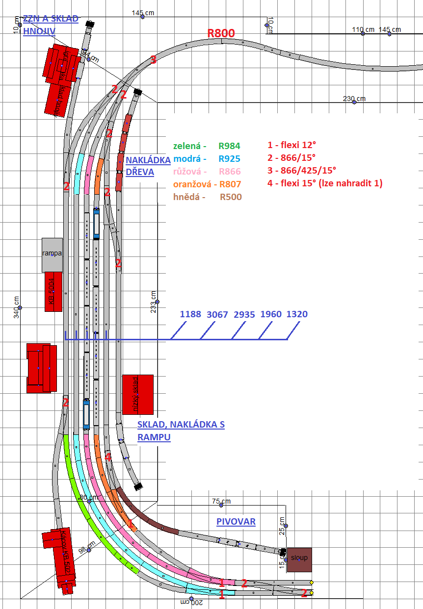 Podle rad jsem použil flexi 12°výhybky pro obloukové zhlaví. Vše je popsáno na obrázku.