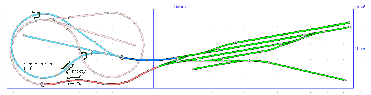 radekkrupka píše:Nevím, jaké budeš provozovat soupravy, ale odstavné kusé koleje uvnitř smyčky tě nutí, abys na ně zajížděl po objetí smyčky z viditelné trati (aspoň u té modré).