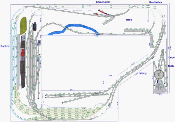 Ze stanice Radkov vychází trať k zadnímu okraji, kde namísto částečně viditelné výhybny je dlouhý tunel, který končí u části s depem. Odtud pokračuje trať přes spouštěcí díl a dvoukolejný most přenesený ze zadní části k odbočce k vlečkovému nákladišti. Za odbočkou se trať noří do tunelu skrytého nádraží se čtyřmi kolejemi v první a dvěma kolejemi ve druhé části. Poté pokračuje opět do zadní části a vynořuje se znovu vedle depa, aby uzavřela "druhé kolečko" stoupáním s vrcholovým tunelem a napojením do druhého zhlaví stanice Radkov. Na úplné objetí kolejiště jsou tedy zapotřebí dvě "otočky", ale je možné nechat soupravu i kroužit mimo skryté nádraží. Mezi depem a tunely SN tvoří trať cosi jako falešnou dvoukolejku, ale je to defacto pořád jenom ovál, jen dvojitý. Jen lokálka tvoří vůči hlavní trati smyčku.